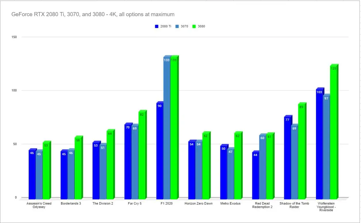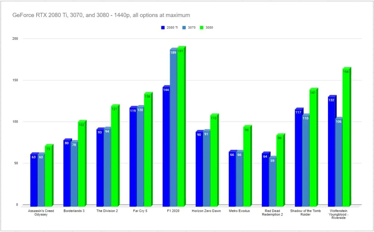 When you look at the differences between 4K and 1440p, we see where the RTX 3070 lives. Obviously every game has its own specs to juggle, but the 3070 is able to deliver 4K at or near 60. If you are like me, though, you’d prefer to run 1440p at a higher rate instead. All of the benchmarks were run at the highest possible settings, including the notoriously rough Red Dead Redemption 2. Despite throwing the kitchen sink at this card, it’s still able to handle Rockstar’s flagship title at 4K and 60fps — impressive considering this is NVIDIA’s current “value” card.