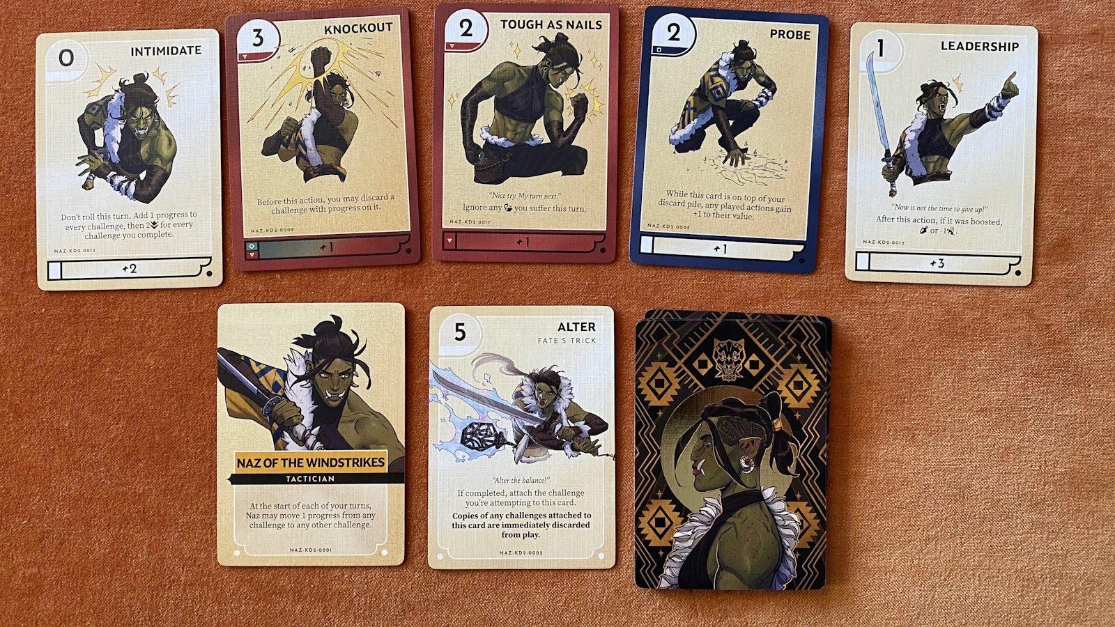Scorn’s Stockade comes with two new player characters, Feyn Longstride and Naz of the Windstrikes. These characters are both very different from the two included in Vainglory’s Grotto. Naz is a tactician with abilities aimed towards working with others. She can move progress tokens around and potentially use special attacks to knock out multiple challenges at once. Feyn has the powerful ability to allow rerolls, which can be game changing and makes him a welcomed character to bring to any dungeon. The variety each of the different characters brings to the game is one of the greatest aspects of Kinfire Delve.