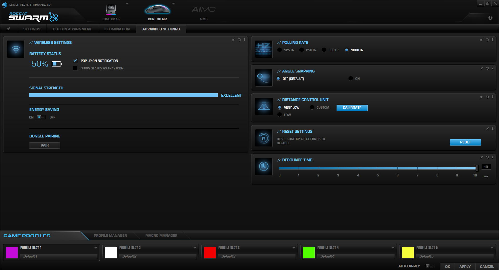 The Swarm application will help you keep track of and make adjustments to your Kone XP Air with the usual settings for button assignments, DPI switches, and more, but you can also monitor the mouse’s battery life and signal strength as well in the Advanced Settings tab. If you’re looking to save a little on your battery life there is an energy-saving option. You are also supposed to be able to adjust the illumination brightness of the dock and the mouse outside of using the AIMO Illumination feature, however I never noticed this taking effect on either device. I assume this is just a bug in the Swarm software and it will likely get patched in the future.