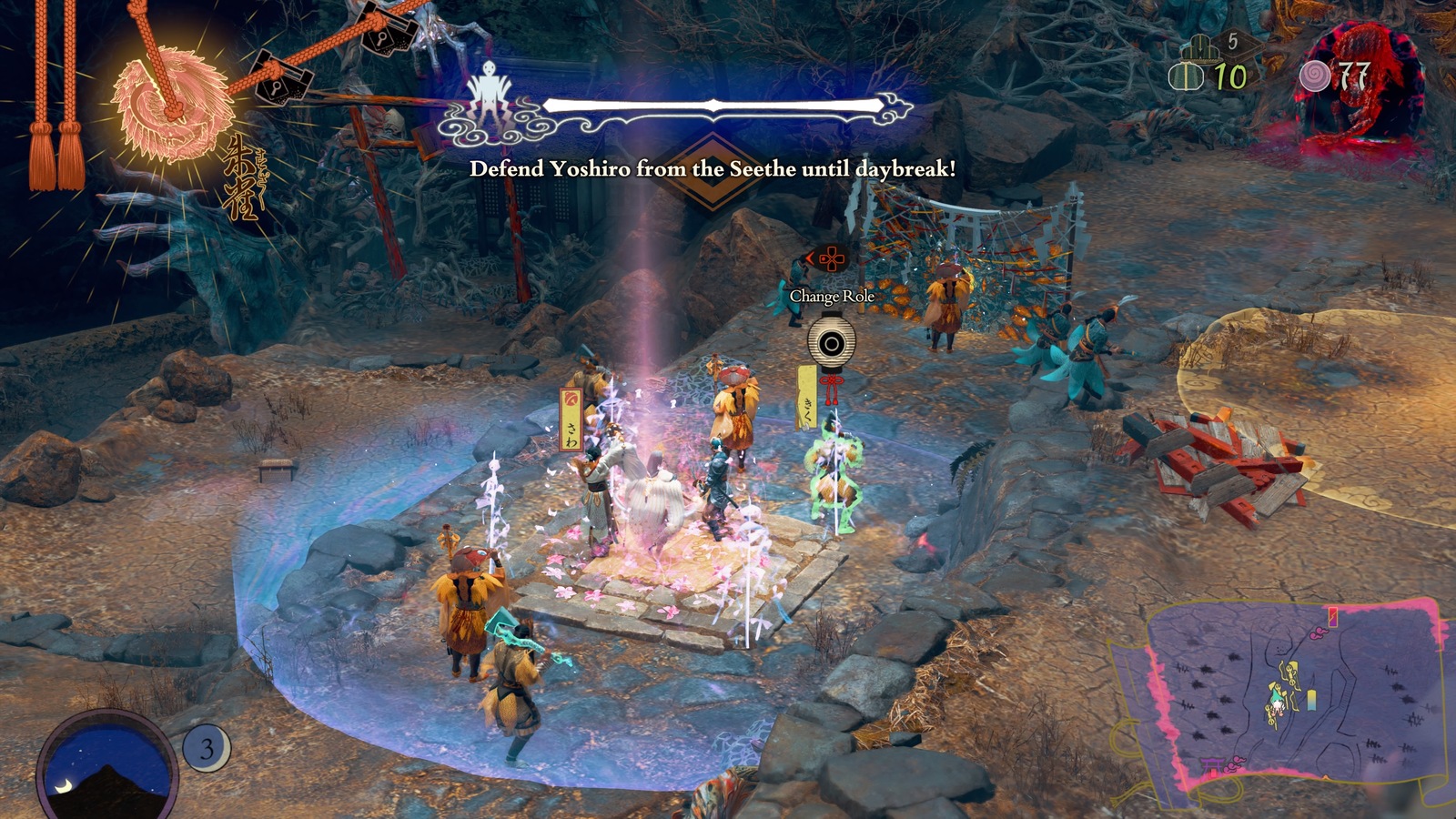 Instead, the strategy that took me through basically the entire game was to build my villager formation entirely around the goddess. Everyone sits in a centralized area around her and covers her from any directions the Seethe may approach from. This plan carries some risk with it because if a Seethe gets past they have a clearer shot to the goddess, but it generally works well. Most importantly, it saves you the hassle of having to wrangle all of your villagers and Soh around too much.
