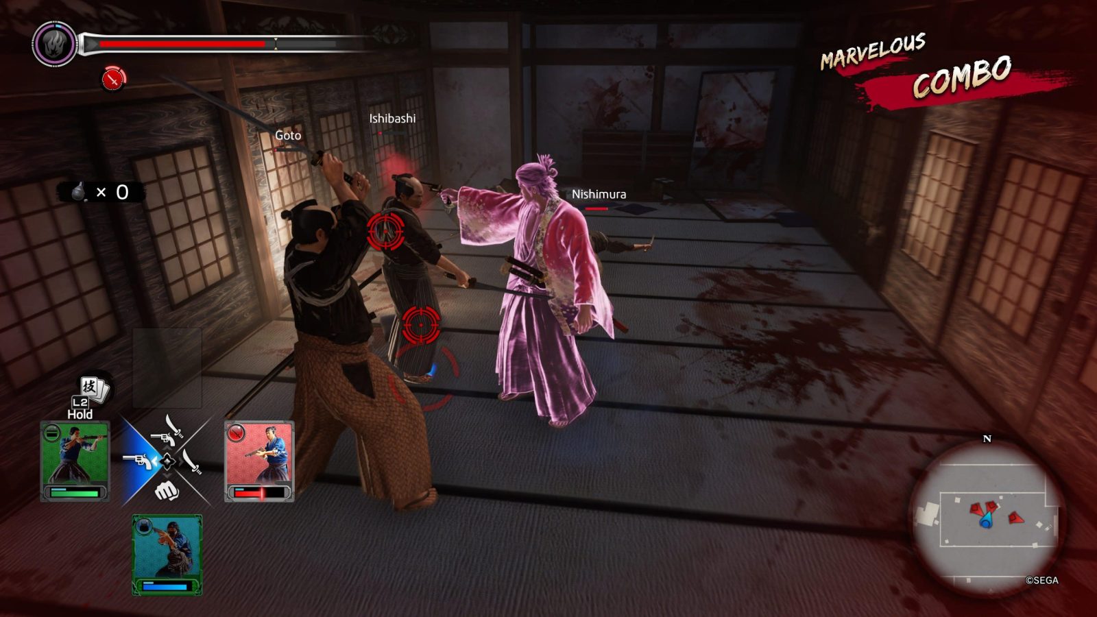 If you’re unfamiliar with Yakuza combat, pressing square will execute a combo while triangle will perform a finisher move, which changes depending on where you are in the combo. The X button allows you to dodge, Circle serves as a grab or other miscellaneous move, and holding L1 will have your character guard while R1 will lock on to an opponent. As you fight, you’ll build up your heat meter, which you can then spend on devastating attacks by fulfilling certain requirements and pressing Triangle. The basics remain the same here, though the specifics vary wildly.