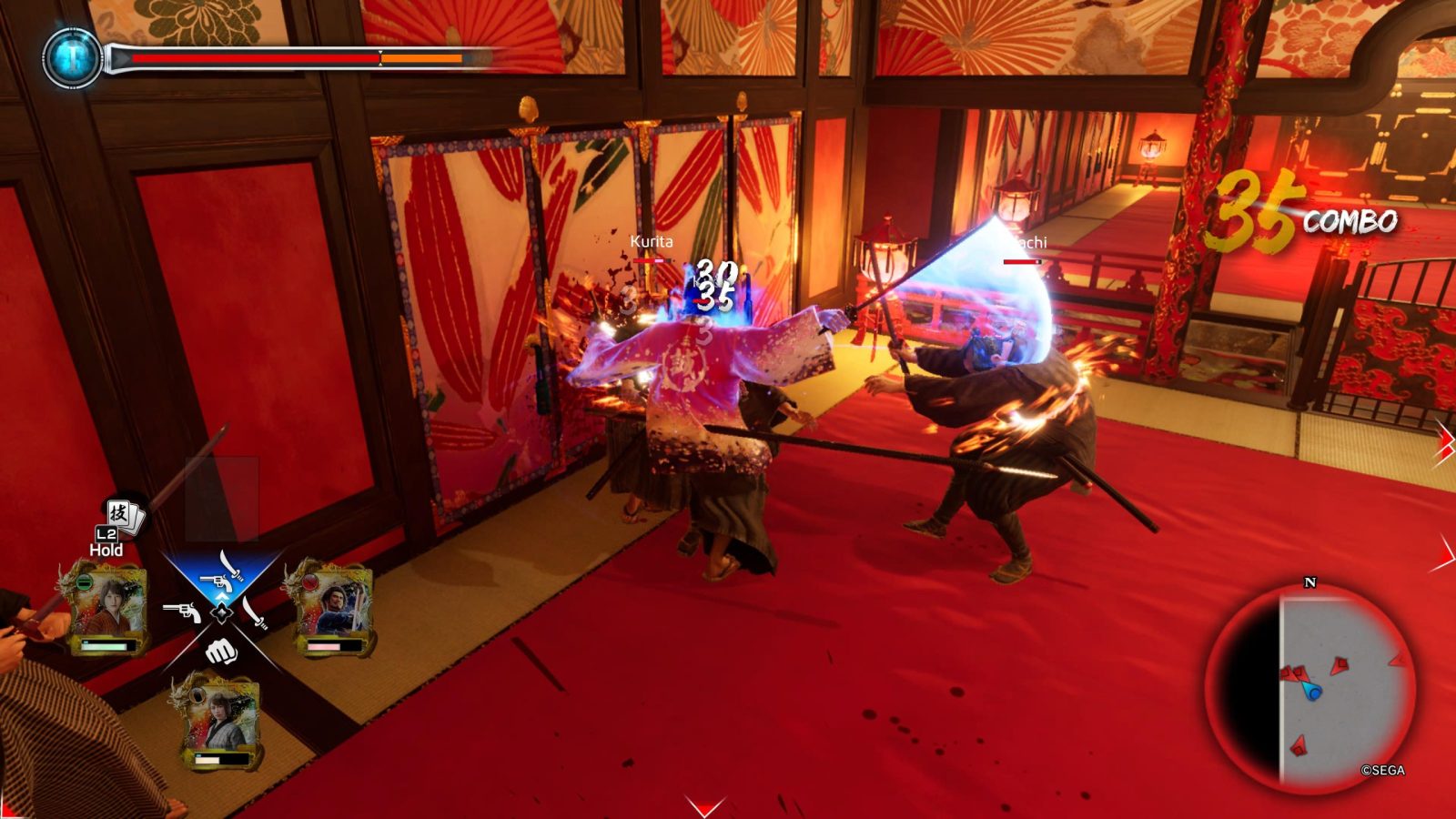 Ryoma will quickly gain access to four fighting styles utilizing a combination of his fists, katana, and gun swapped by pressing the corresponding buttons on the D-Pad. Swordsman is your standard moveset, utilizing a katana for slow yet powerful strikes with Square and Triangle as well as Circle serving as a guard break. While you’re slow to move and dodge in this style, you can block and parry most enemies since they also use swords.