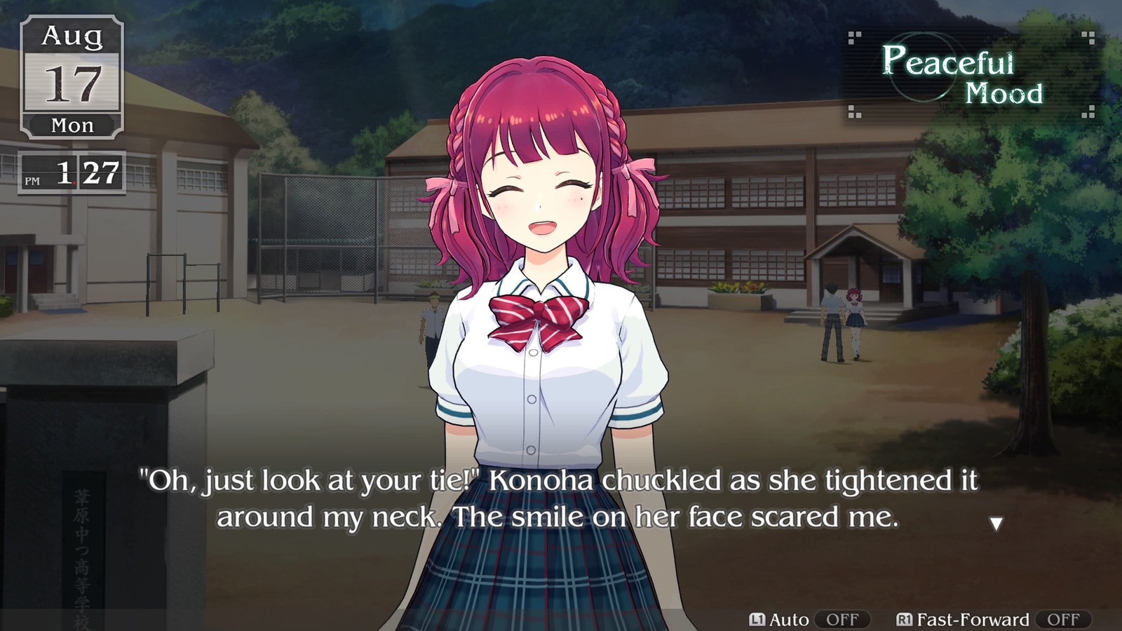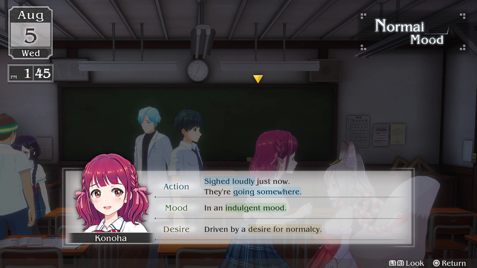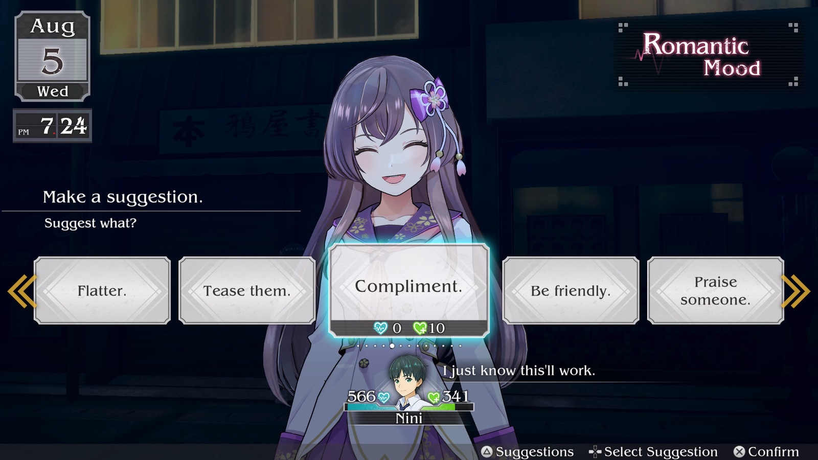 The limits of the suggestion system hinder your ability to connect with anyone around you. Suggestions don’t directly lead to getting to know a character better. Instead they simply buff stats into one of three categories: friendship, affection, or hate. Once you hit certain thresholds for these stats, your target will then spit out a new conversation. Basically, you must keep spamming the same suggestions over and over until you see something new. If bulldozing each character with the easiest suggestions weren’t artificial enough, the constant need to repeat the process drains the characters of any life to be found.