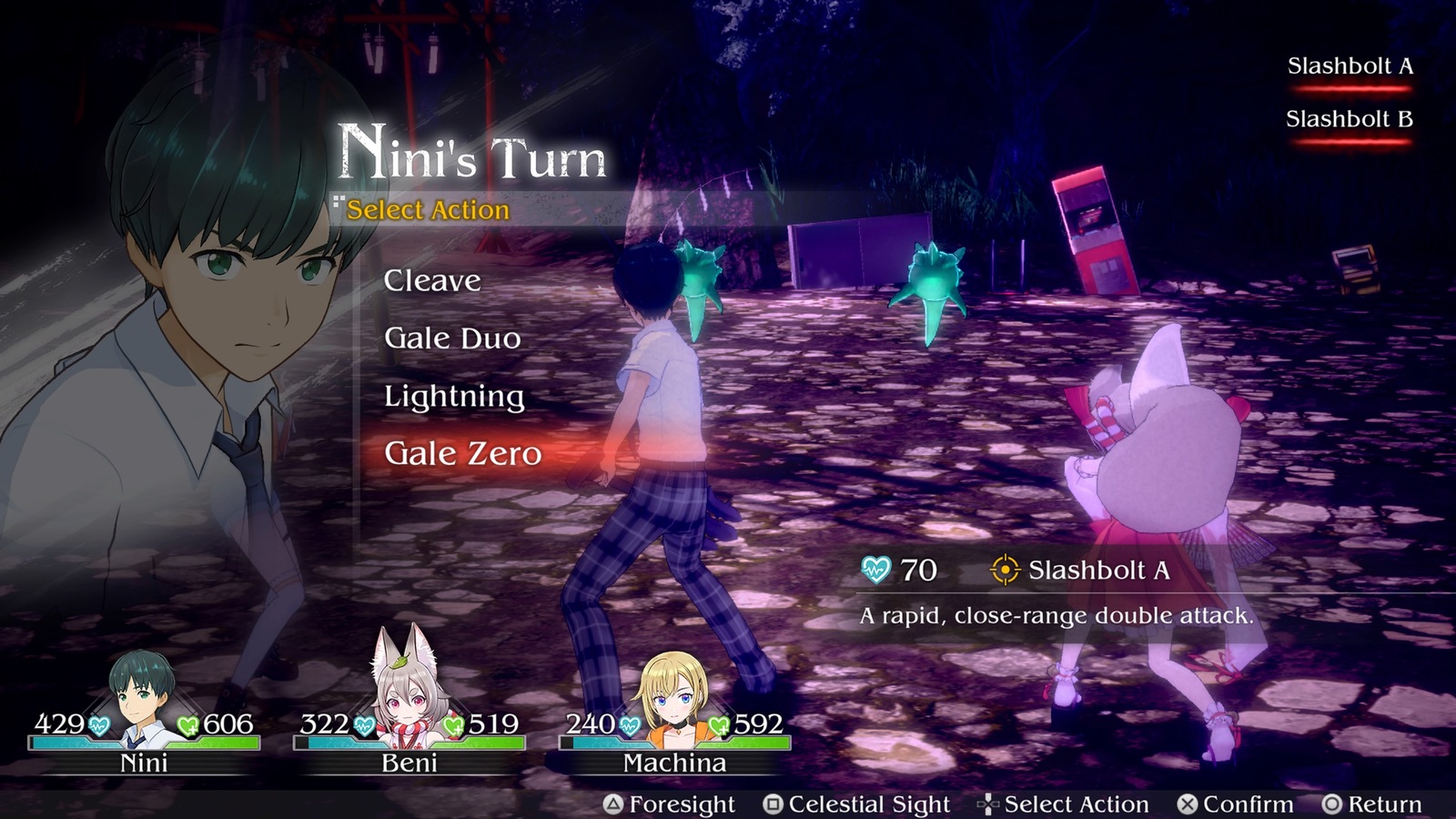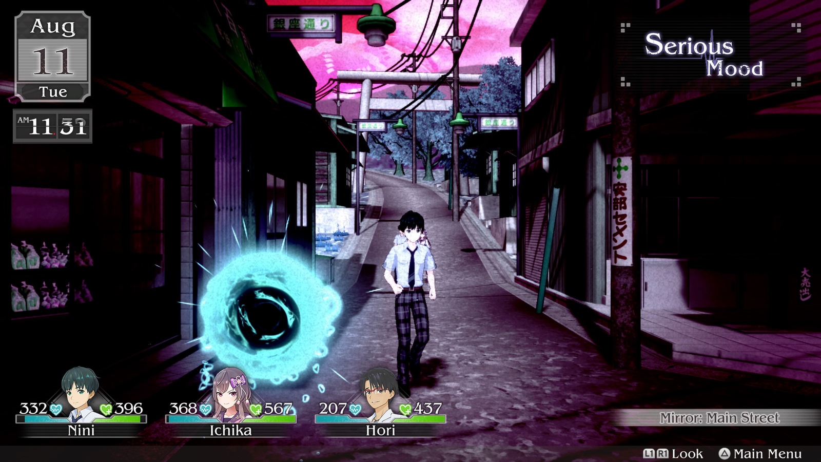 However, Loop8 does not follow much of a story structure at all. An overarching story about the invading monsters exists, yet its events and anything mandatory to completing them keeps the details incredibly sparse. Basically, monsters called Kegai sneak into the town one by one every few days. They’ll possess one of your friends, and if you don’t identify who got possessed and stop them in time, the game will end prematurely. You gain little insight into the nature of the Kegai or even the characters (at least anything that won’t be obvious by talking to them) through these battles. Chatting up the townspeople provides the vast majority of the exposition about what’s going on with the world around you.