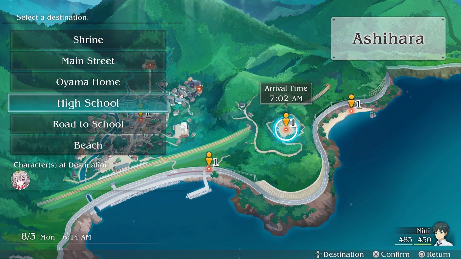 Loop8 resembles a playable version of observing fish in an aquarium. The game takes place in a small Japanese town with various “landmark” areas. Your fellow citizens congregate at places like school, the beach, or the shrine. Much like fish, you can rarely tell what they’re doing at any given time other than existing. Luckily, that leaves them open for buffing up your stats with them. You primarily accomplish this by striking up a conversation with someone making a “suggestion.”
