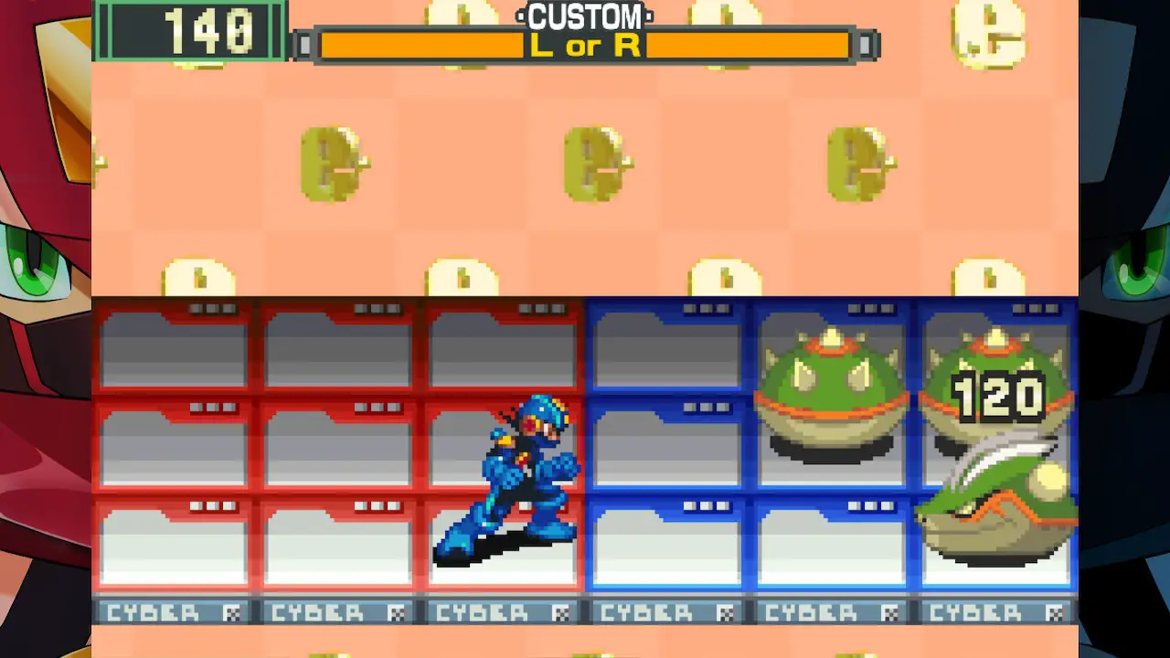 Battles take place on two 3×3 grids: one MegaMan can freely move on and one for the enemy. While a Net Navi can battle on their own using B for normal attacks, they can fight more effectively using chips sent each turn by their operator. At the start of battle or after a gauge at the top of the screen fills up, Lan can select moves like a big cannon shot, a sword slash, HP recovery, and more used one at a time with the A button. You can’t just stack chips all willy nilly though. You can send up to five chips at once, but only if they are the same type, like two cannons, or the same letter, like a sword and cannon both with the letter A. Only five chips are drawn from your customizable Folder, or deck since this is basically a card battler, but you can sacrifice a turn to draw more with various conditions depending on the game. Those are the basics though: defeat all enemies using your buster and chips, earn new chips by doing well, and so on.