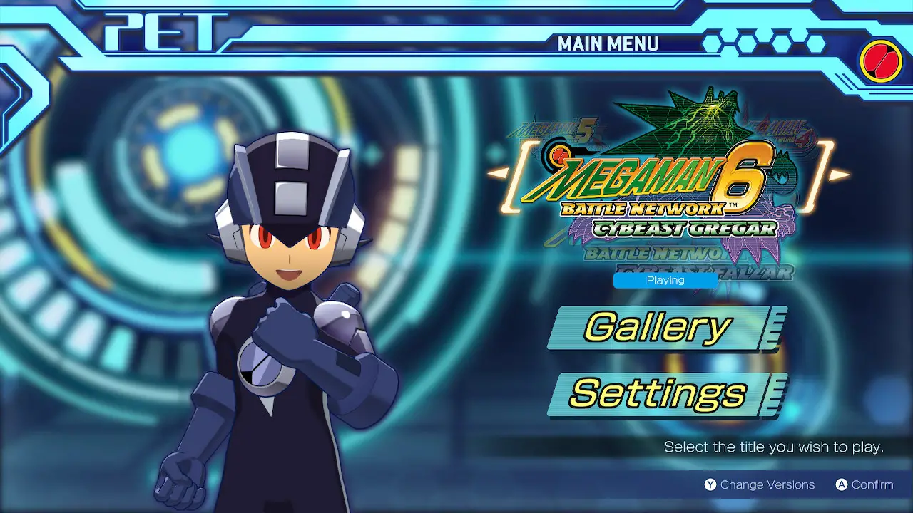 MegaMan Battle Network Legacy Collection comes in two volumes, which contain 1-3 and 4-6 respectively. Technically this totals up to 10 games, since 3-6 have two versions each like Pokemon, but I imagine most people will only play one version. Version differences come into play near the end of each game, so don’t worry about it too much unless you’re trying to collect and do everything. The Battle Network series follows Lan and his PET Net Navi MegaMan.exe as they stop evil plots that would affect both the real world and the net. A PET (PErsonal Terminal) is essentially a virtual assistant device taken to the next level, they help their operators with everyday tasks, explore the net, and delete viruses in turn-based battles.