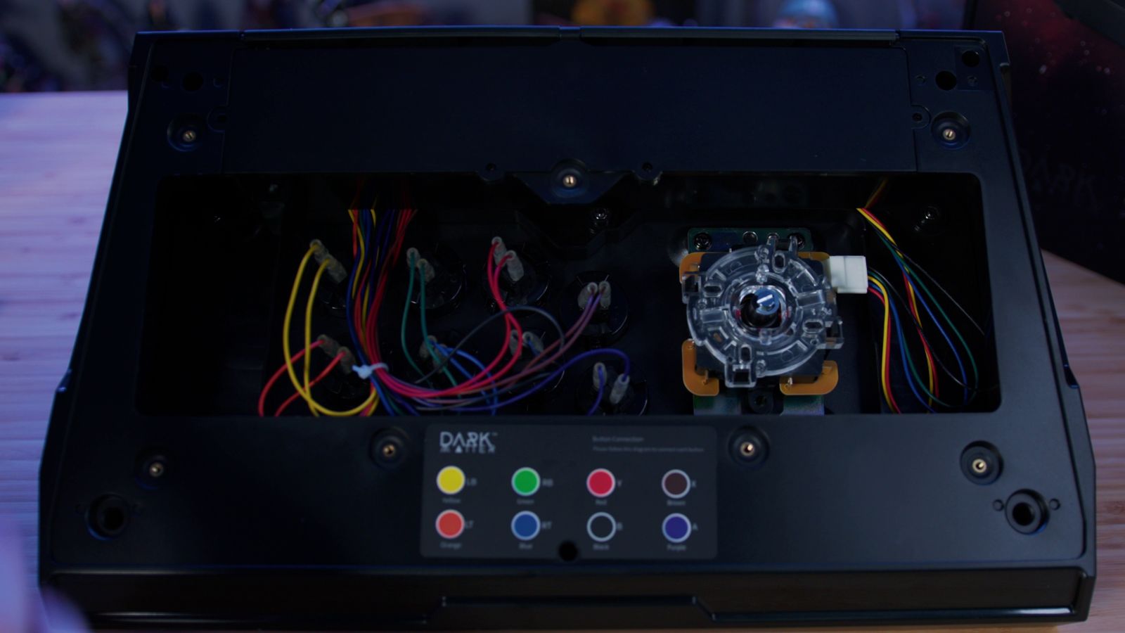 Pulling the hex head screws from the rear of the Dark Matter Fight stick reveals an extraordinarily well cabled set of buttons and a stick. As the device uses a legit Sanwa Denshi joystick, as well as Sanwa buttons, there’s literally nowhere to improve. It also means that if something failed far down the line, you could easily swap it out by unclipping the offending button and popping in a new one. Similarly, swapping the stick is a single connector and four screws, meaning you’ve got a wealth of options available here as well.