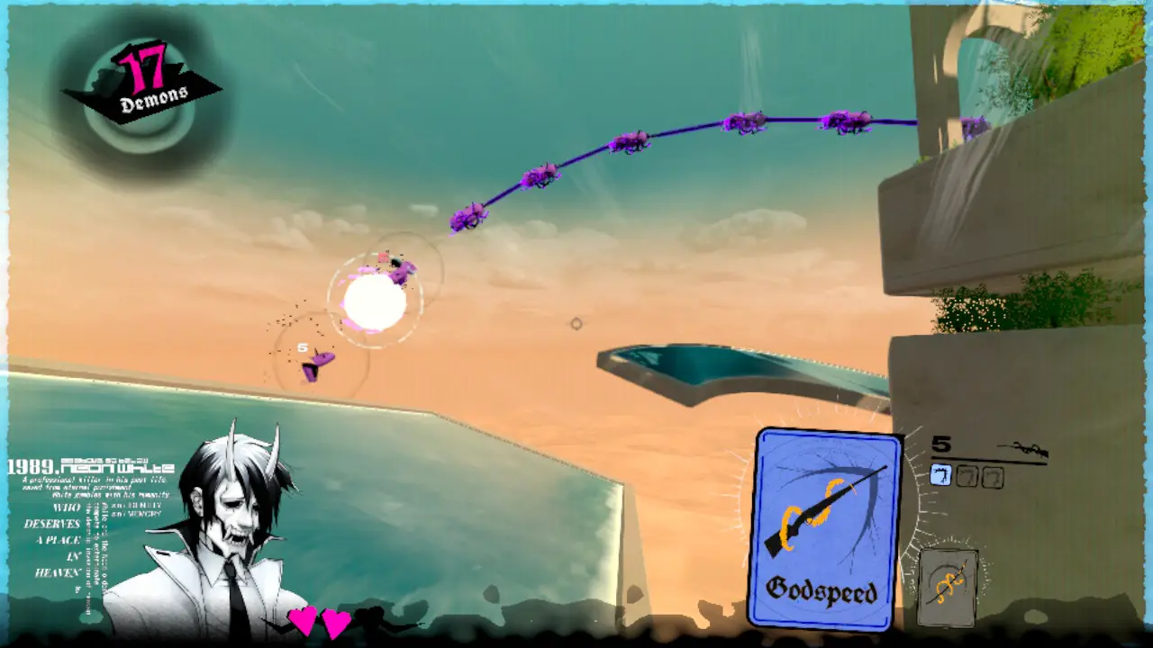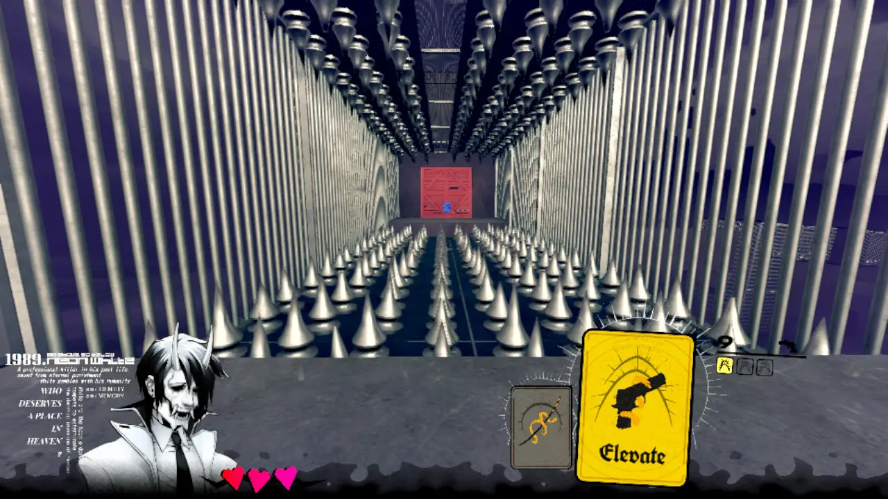 It also helps that Neon White looks and sounds heavenly (pun intended). The 3D levels use hard lines and stark colors to remain easy to parse, but each world has some color cohesion that makes it memorable and allows the 2D demons to stand out since they consist of mostly black and darker colors. The music you’ll be listening to as you jump and shoot really helps put you into that flow state too, with fast beats that almost make this feel like a techno rhythm game.