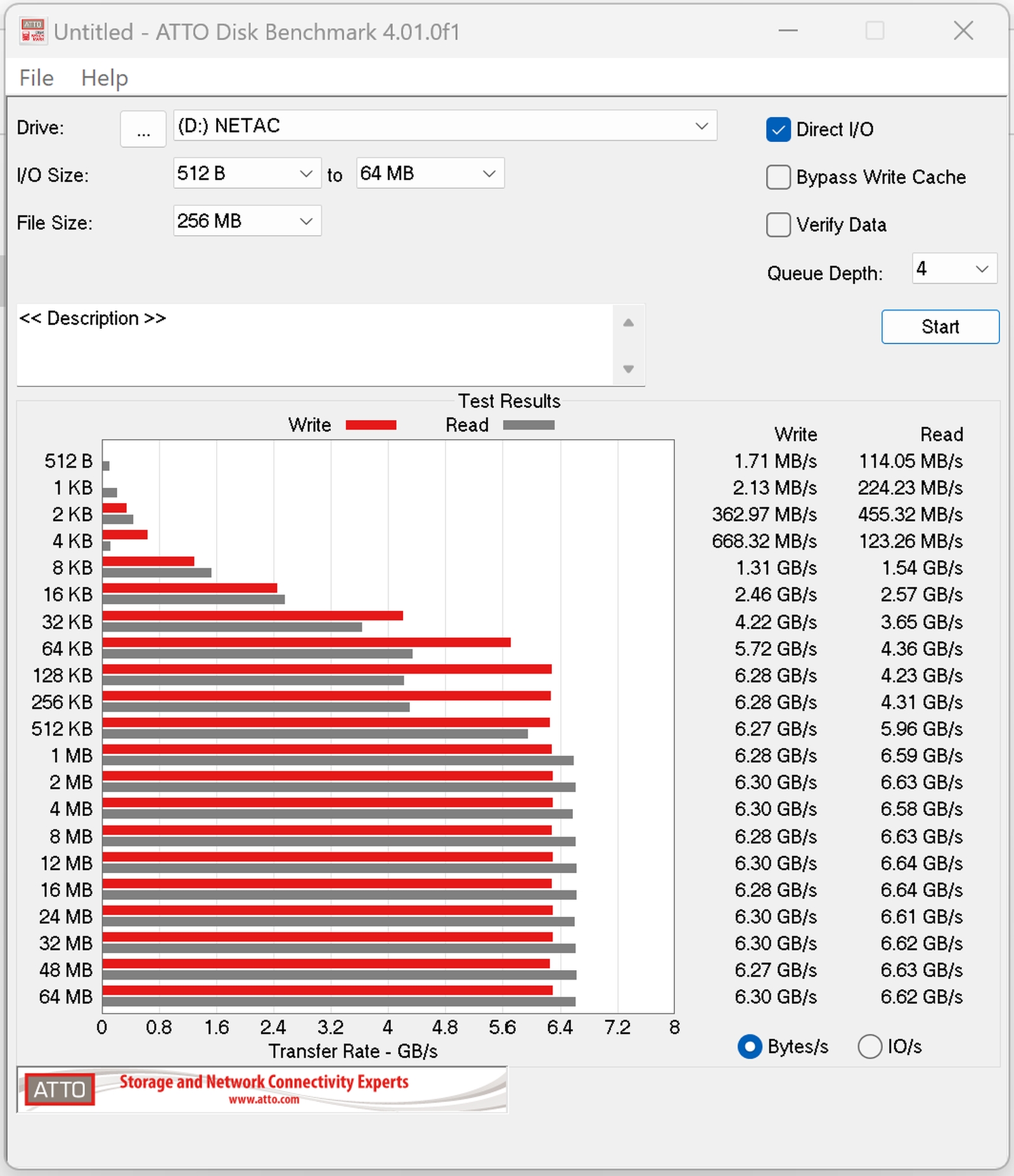 I also like to use ATTO as it shows a variety of block sizes, and once again with the drive empty. This shows a longitudinal view of the drive’s performance, accounting for the ramp-up time as well as an example of how small files in a row might appear slower.