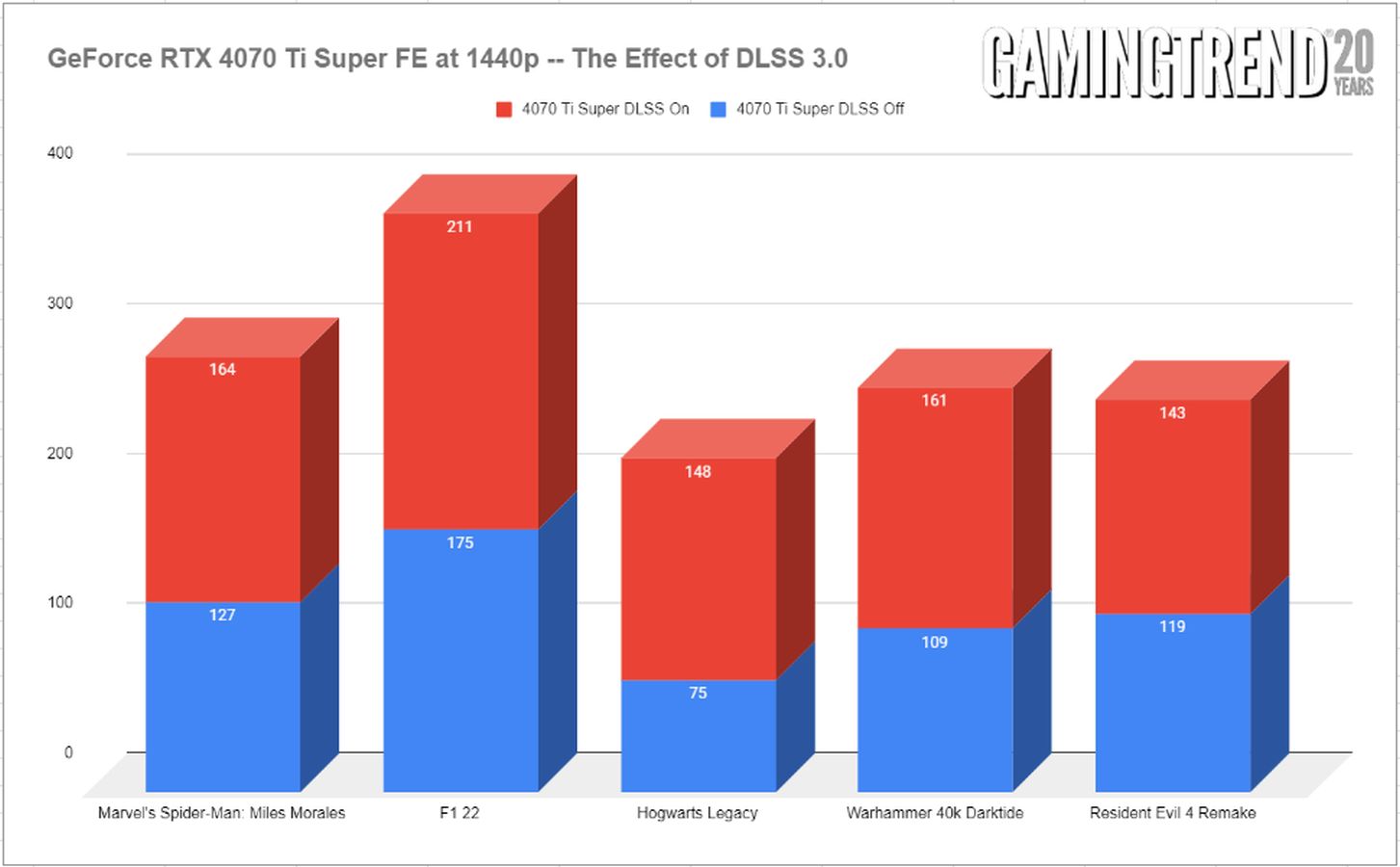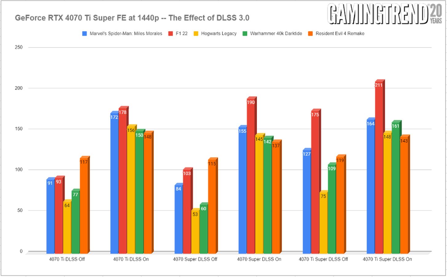 A more broad look at current titles reveals that the RTX 4070 Ti Super is more than a simple bump from the non-super variant, or even the non-Ti version. In most cases we are seeing more then 20fps average increase over previous 4000 cards. It’s also immediately clear that the effect of DLSS 3 is dramatic, and in so many cases, the card goes from good to great. Obviously some games benefit more than others, but it’s clear that DLSS 3 is the difference between a smooth experience and framerates. At 1440p there’s enough horsepower to go around, giving the player more of a choice on how aggressive they might choose to get with the DLSS slider, or turning it off entirely if they wish. In fact, there’s likely more than enough extra horsepower to have your cake and eat it too, hitting 4K and 60+ fps without too much stress.