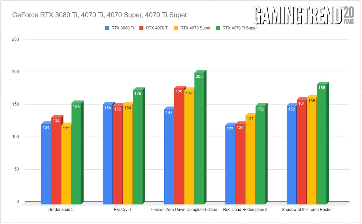 The biggest comparison folks are likely to make is the approximate delta between the RTX 4070 Ti (our review here) and the 4070 Ti Super, though it’s equally valid to look at the 4070 Super (our review) as well. As such, we’ll be doing precisely that, comparing these three cards, as well as a quick glance back to the 3080 Ti for rasterized DLSS 1 and 2 performance. It’s important to note that reviews are a point in time, and driver maturity and game patches are likely to push numbers higher. As such, focus less on the number than the delta between them. Or don’t – I’m not your dad.