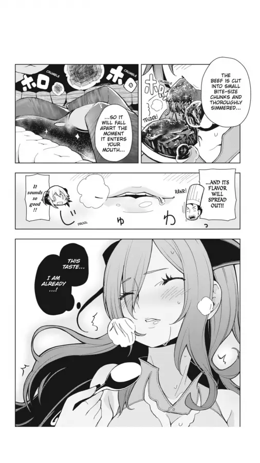 First off, I just want to commend the art quality of the food represented. Much like Food Wars and Giant Spider & Me, the artwork for the dishes represented here look so darn tasty. Even simple things like beef stew and rice balls are made with some tender loving care; heck, even the oddly sensual panels describing how a character reacts to eating food are rather detailed. Luckily, it’s not as… out there (to put it lightly) as Food Wars, but it can get a bit unnecessary at times.