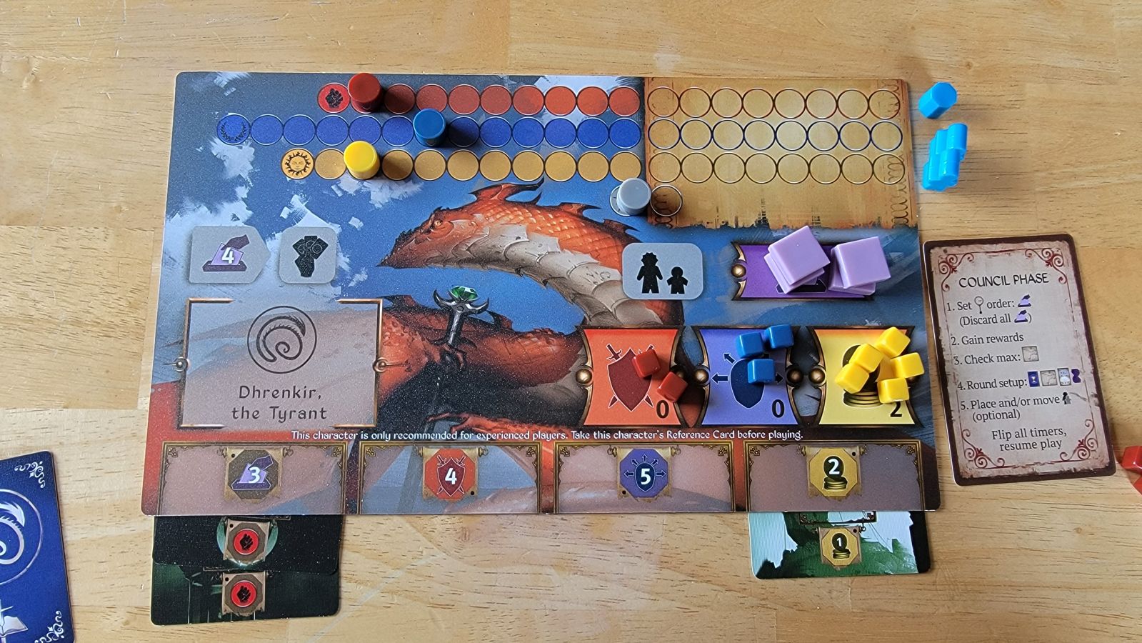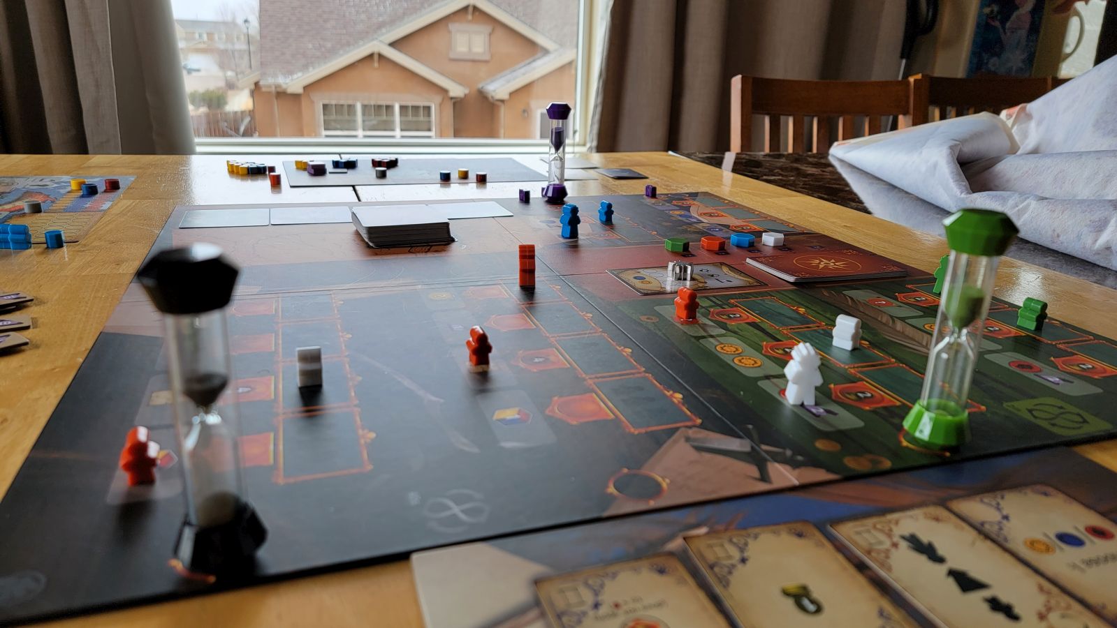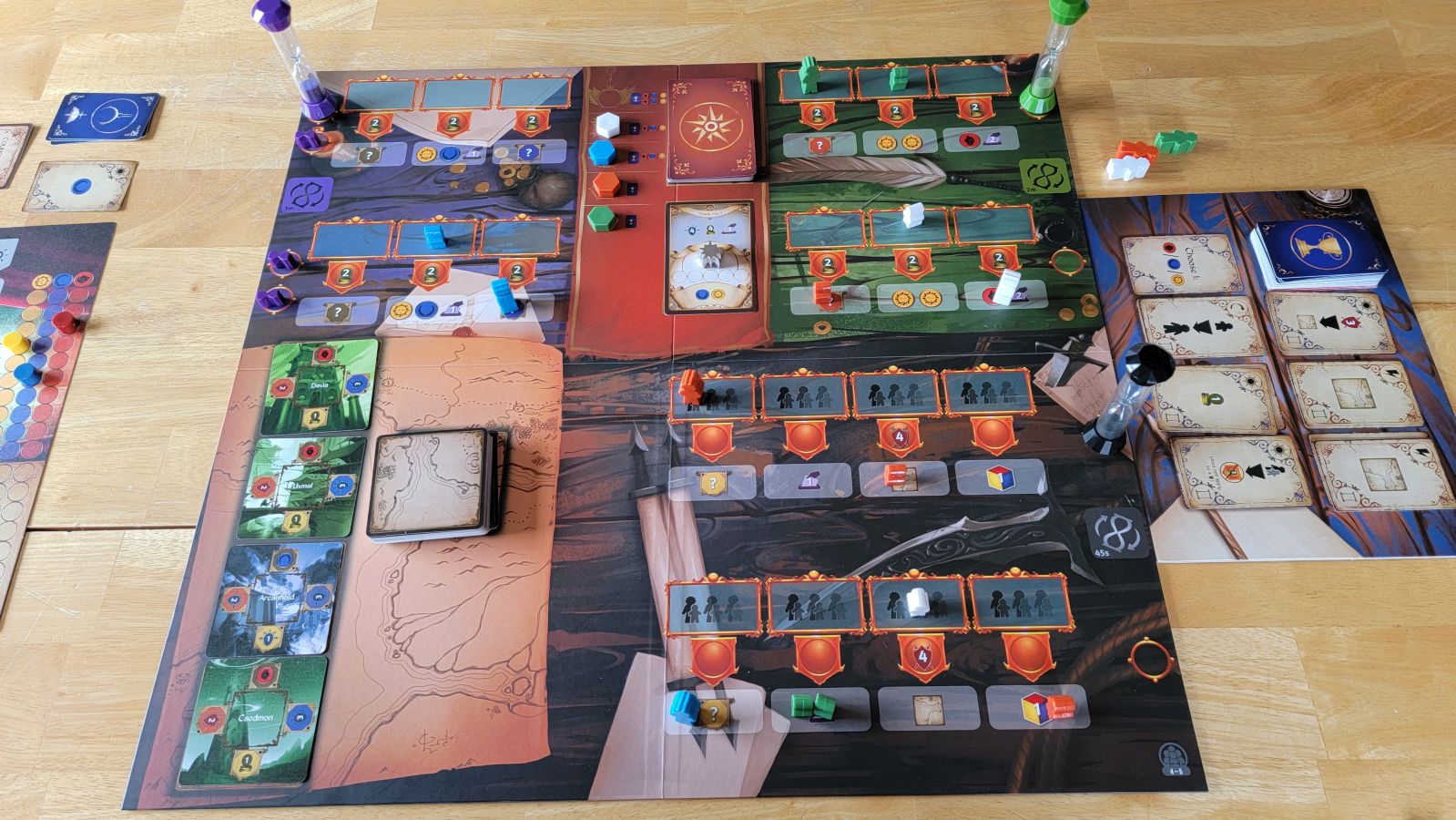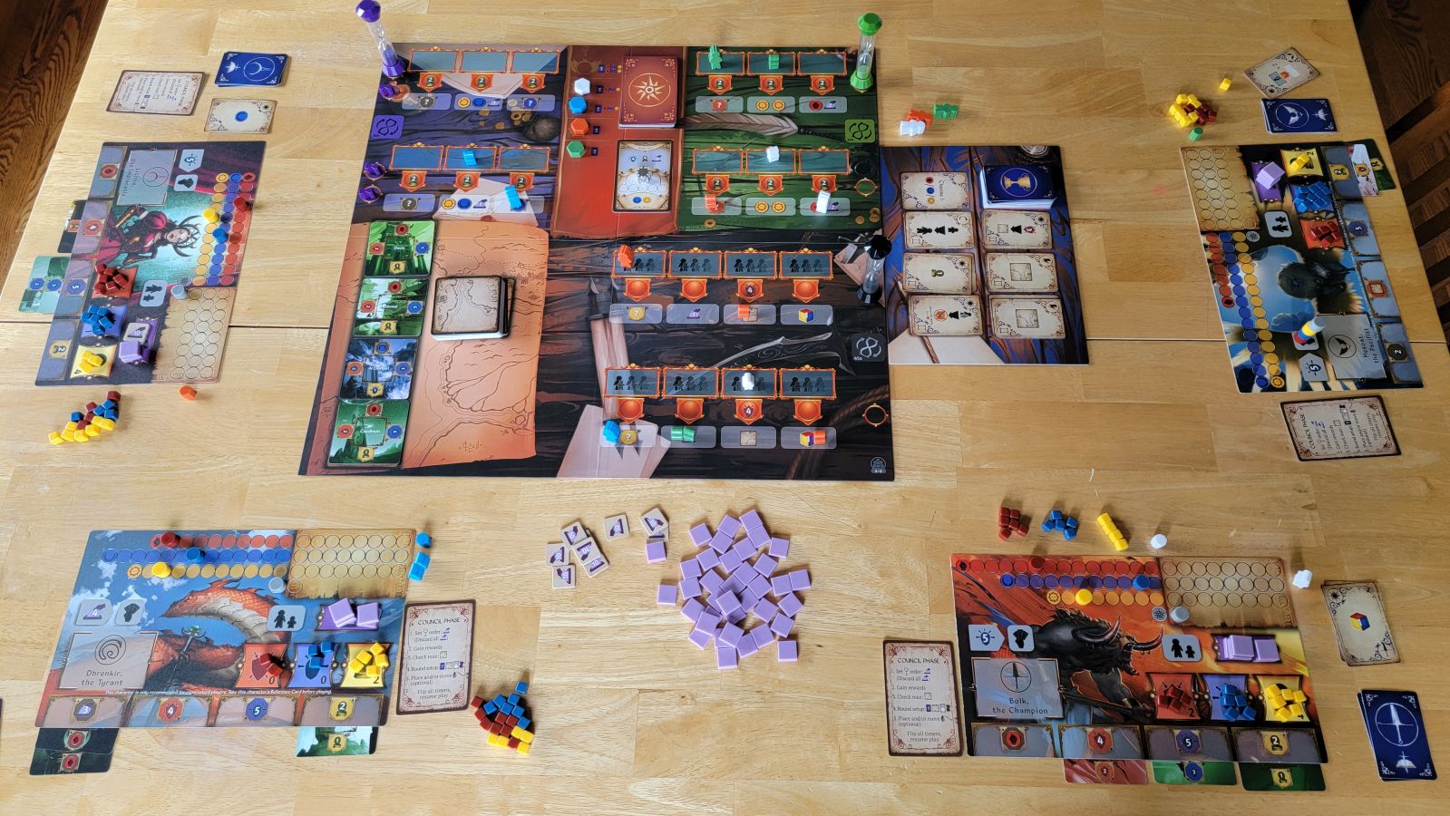 The end of a round occurs once all the purple tokens on the purple timer’s spaces have been removed, each coming off every time the timer flips. Once the round ends the council phase begins where players determine privilege and get extra cards, and reset for the next round. Players go through this cycle of actions and timers followed by a council phase for four rounds total. After the fourth round the player(s) that have moved all of their tracks into what looks like a piece of parchment on their boards(i.e. Advancing the tracks far enough) score points based on how far their trackers have progressed into the parchment area of their tracks. Once final scores are determined then the player with the most points wins, and if there is a tie then the player with the highest privilege is the winner.