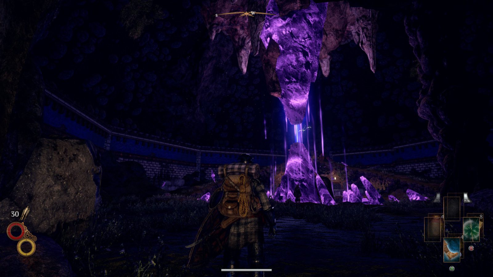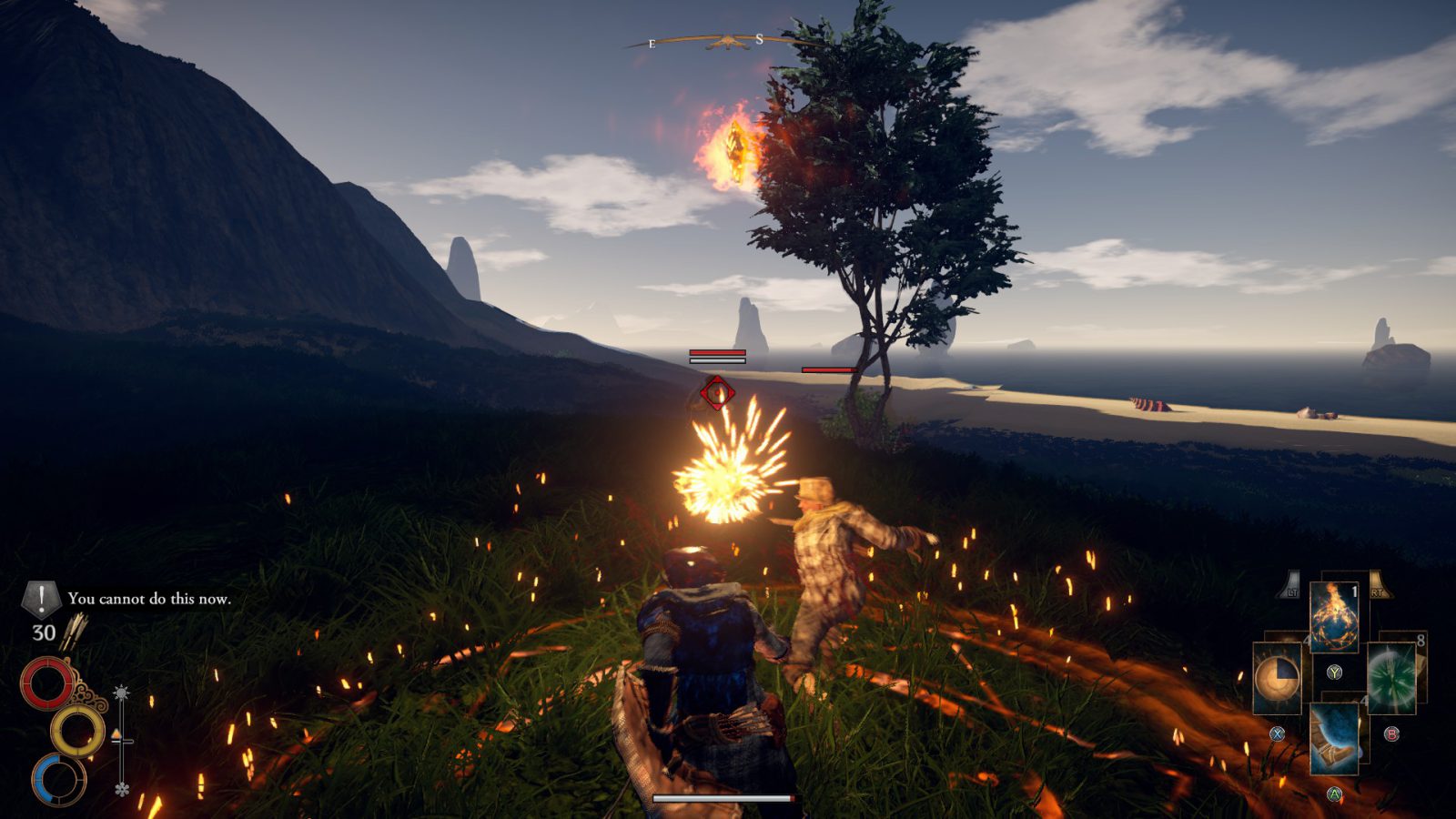 I say “dying,” but one of Outward’s most interesting ideas is that you never actually stay down for good. When you run out of health, you’ll instead be spirited away to one of several locations which seem to be chosen based on where you were knocked out and by whom. You may wake up in the nearest town, on the beach, at the campsite of an unseen benefactor, or, if you’re particularly unlucky, in a dungeon. If you were wearing your backpack at the time, you can find it nearby. If not, you’re in for a long walk back to wherever you lost it (your compass will graciously point the way back to your pack whenever it’s dropped). It’s a great way to turn the game into one continuous story about your triumphs and defeats, rather than a disjointed narrative chopped apart by reloading save points, but it does lose its charm after a while. There were times when I would have rather just started from a checkpoint than slogged through whatever complications it presented. I suspect I would have felt differently if the rest of the game wasn’t so laborious.