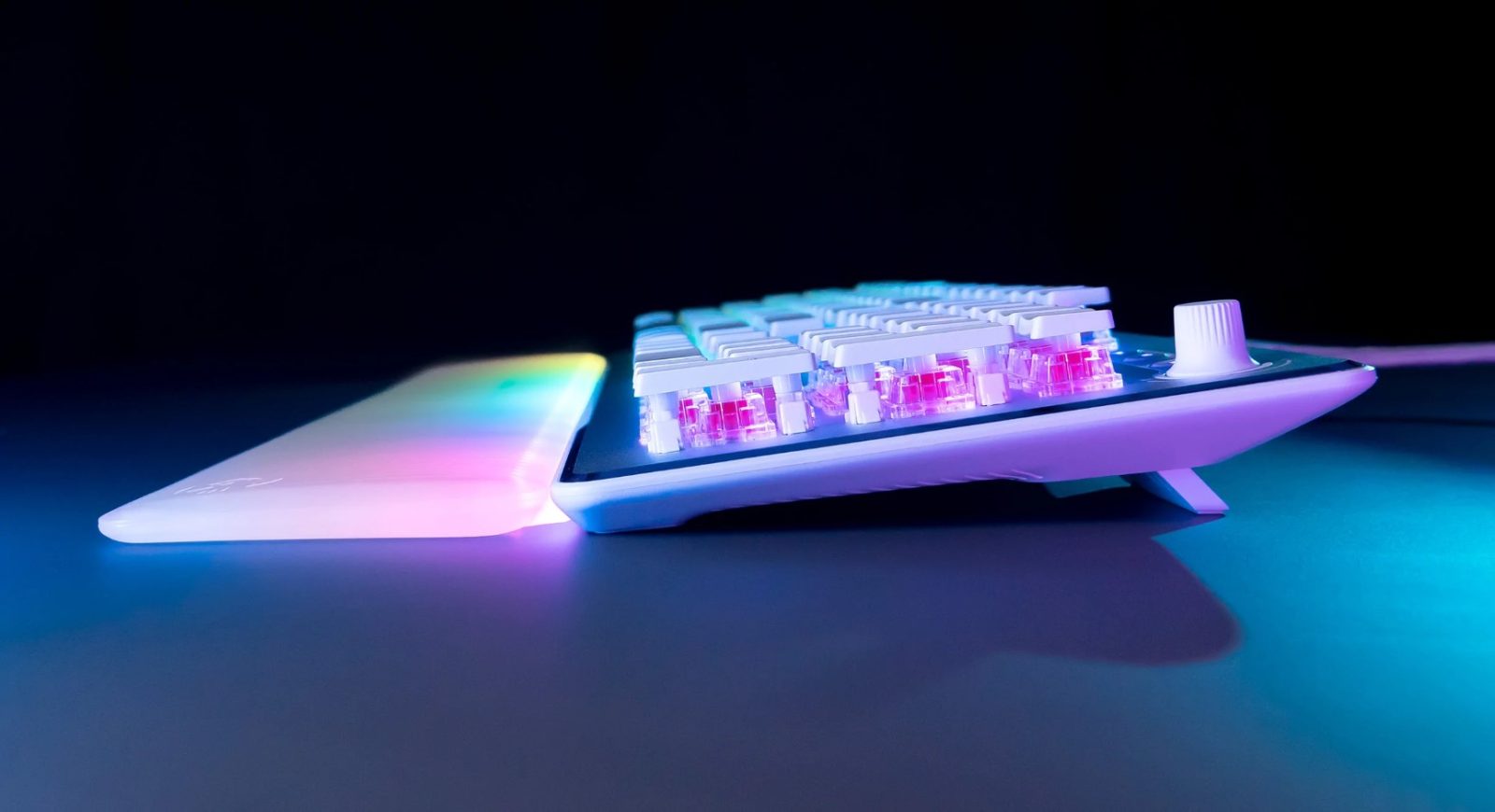 What enhances the experience, both for my wrists and the RGB lighting, is the translucent palm rest. This rest isn’t too thick, but feels extremely comfortable. It attaches to the bottom of your Vulcan II Max with a couple of specifically shaped insertable tabs, so it’s not permanently stuck to the bottom. Even still, it’s been pretty rock solid during my time with it, not moving out of place. What amps this particular palm rest up to eleven is the lights stationed at the insert points, pushing RGB into it and giving off some awesome illumination. It’s a unique feature, and I love how it looks.