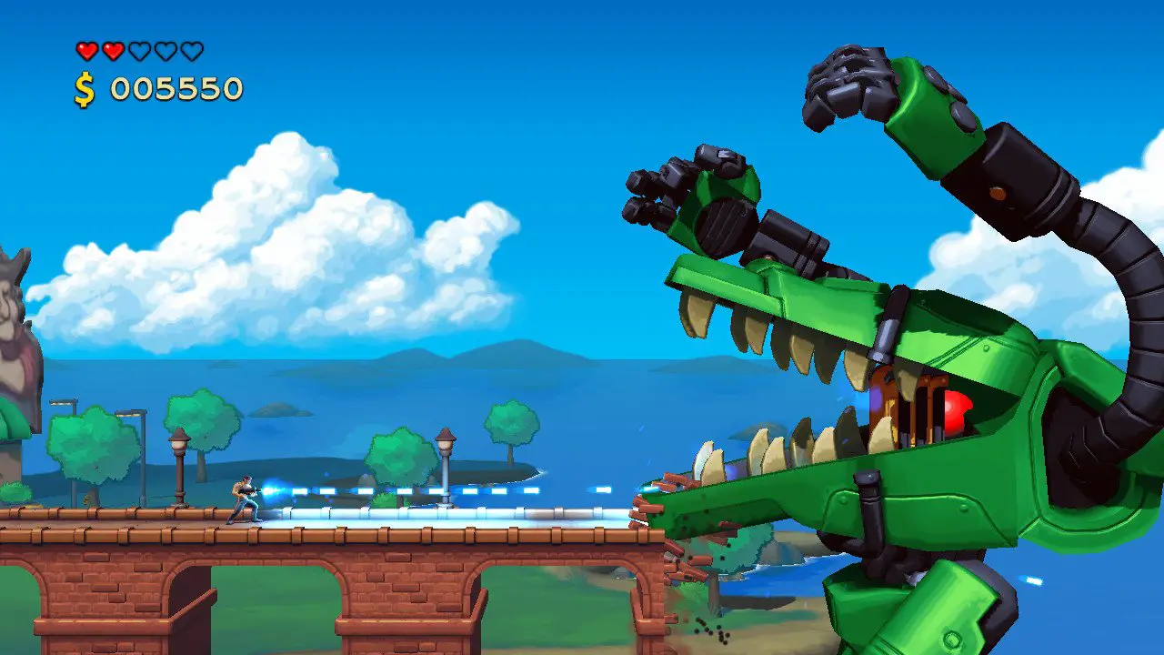 That being said, Mechstermination Force is a tough but (mostly) fair game. Every boss has attacks that are easily telegraphed and avoidable, and while the game can pummel you time and time again, there is incentive to grind and practice due to the upgrade system, where you can purchase more powerful weapons or even more health with the money you receive from fighting. This means even if you end up failing a couple… dozen times at a boss, there’s still progression in the form of collectible currency you can use to strengthen yourself up and try again. You can also replay defeated bosses by going into the arcade machine at the hub world, which is helpful if you want to beat your own record (you can get stars and more money by completing bosses with insane times, or even by not taking any damage). You can also play the game with two players, which could be helpful for those that want a slightly easier experience. It might only be a few hours long, but Mechstermination Force has some great replay value for those that want to hone in their skills.