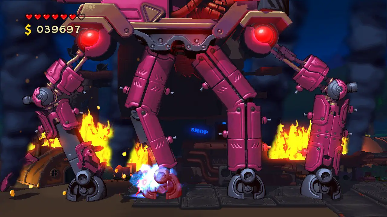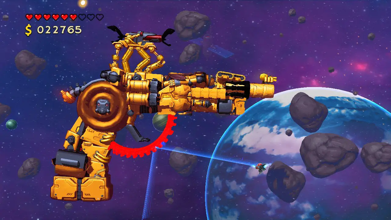 While there are some great highlights in the package (the Mega Man-feeling room that hosts the Mechrachnid and the three-enemy Trimechalon spring to mind), there are a few fights that feel unfair due to the mechanics. Mechbeth (a towering colossus-like robot you encounter after you get the gloves) is probably my least favorite because the game’s climbing mechanics feel clunky and inaccurate. There were many times in the fight where I would lose my grip, even though I knew I connected with a wall, and the constant need to switch between climbing and shooting made this boss a bit more monotonous than the rest. I actually didn’t like the climbing portions of the bosses, and those that did use this mechanic extensively felt more frustrating than fun. The hit detection feels sloppy, and the bosses with platforming or dodging mechanics were more superior in that respect. In a game where you only fight bosses, this does hamper the experience somewhat.