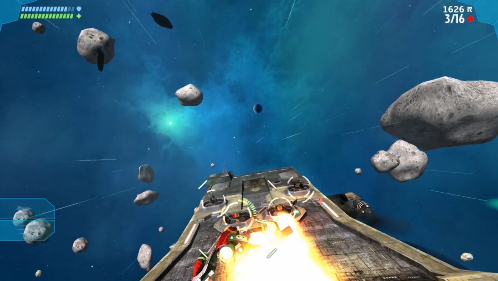 In terms of gameplay, Star Horizon follows the simple format of games like Star Fox. Your ship has a preset path that it follows, but you are given a small area to move up, down, left, and right in. You’ll also be able to dodge in any of those directions with the press of a button, along with firing three different weapons, all mapped to their own buttons. Your weapons consist of a laser gun, missiles, and torpedoes. The gun can be fired non-stop, while the missiles and torpedoes each have a cooldown between uses. The cooldowns aren’t very long, so that’s a plus. The missiles can be locked onto multiple targets and, when fired, home in on targets, while the torpedo only fires one powerful shell at a time. In other words, missiles are better for crowd control, while torpedoes are better for singular damage. I personally preferred the missiles since I’d typically face multiple enemies at once, but the torpedoes came in handy when a tougher enemy would appear.