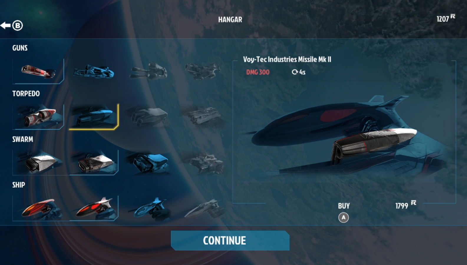 As you play through the missions and destroy enemies, you’ll earn credits. These credits can be spent at your hangar in-between missions to buy upgrades. You can upgrade four things: your gun, missiles, torpedoes, and ship frame. Each upgradable aspect has three upgrades to them as well, but you must upgrade them in order. For example, the gun adds a second gun on its first upgrade, jumps up to a total of four guns on its second, and becomes a powerful cannon that fires fast plasma balls on its third. The damage the guns do also increases with each upgrade. The missile upgrades increase the number of enemies that can be locked onto, reduces its cooldown, and also increases the damage that they do. Torpedo upgrades increase the damage done and reduce the cooldown as well. Upgrades to the ship’s frame raise the ship’s maximum armor and health. As you might expect, the cost of the upgrades rises as you work through the more powerful ones. In other words, you’ll want to save up your credits or grind previous levels to build up a good supply. I tended to focus on gun and missiles because those were the most useful options for me.