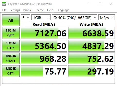 Once you’re done, it’s on to checking out the space and speeds. I had about 1.8TB of the 2TB drive available, which is a chunk but understandable. It’s not uncommon for manufacturers to measure with 1000kb instead of 1040kb, meaning that they end up with slightly less than the full capacity. You can learn all about that here.