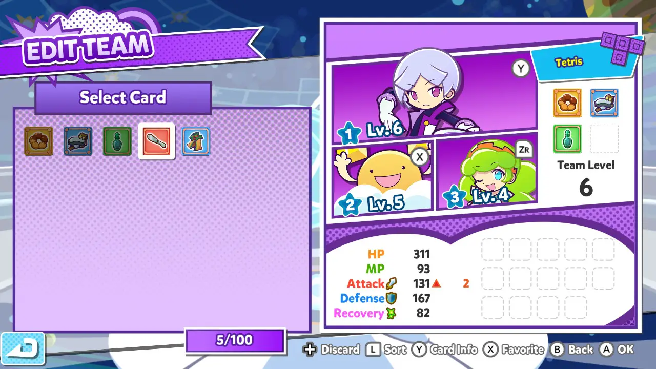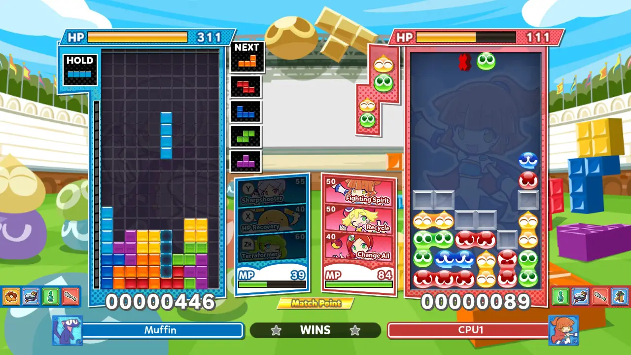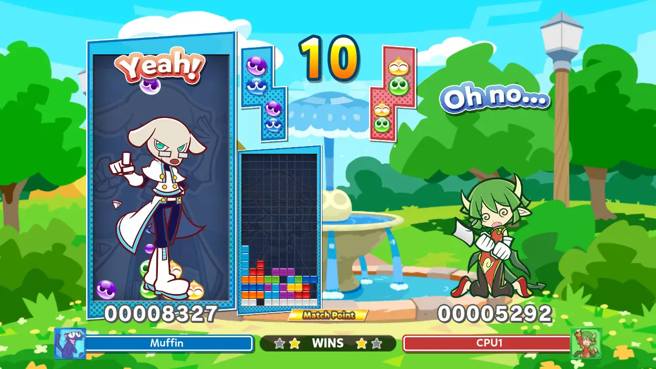 Matches are incredibly quick, especially if the characters aren’t all leveled up. Each character levels up as you play with them, meaning that early matches are going to go even faster, and choosing another character later on will sorely disadvantage you. It feels unrewarding to win a match after doing a single four chain of Puyos or one Tetris. Even the skills that clear lines do damage, which feels even less fair.