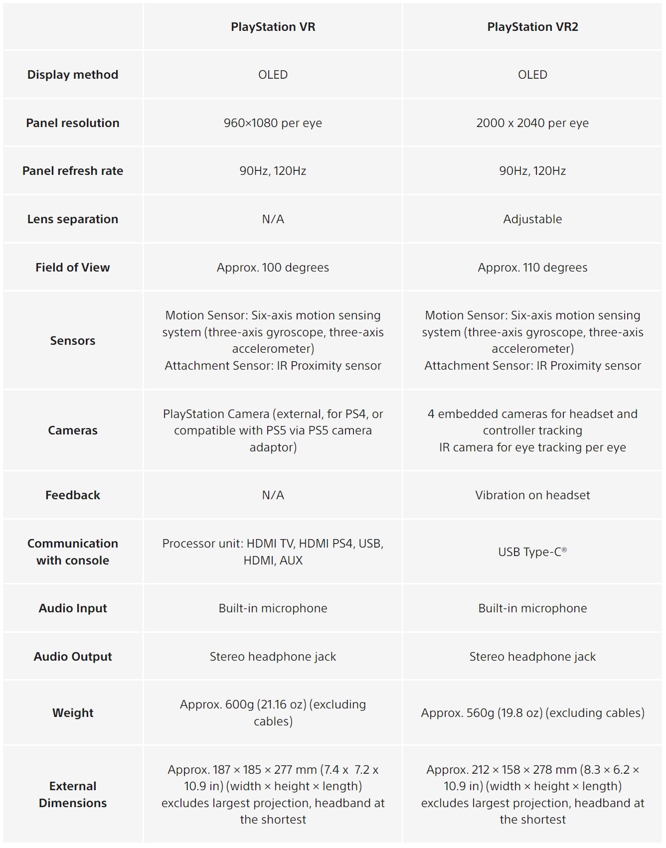 The first thing you probably want to know is how this compares to the first iteration. Why should a PlayStation 5 owner purchase a PSVR2? Well, there are a number of reasons, and they are laid out handily in this chart below. I’ll drop that in, and then we’ll take a look at the ones that really matter and why: