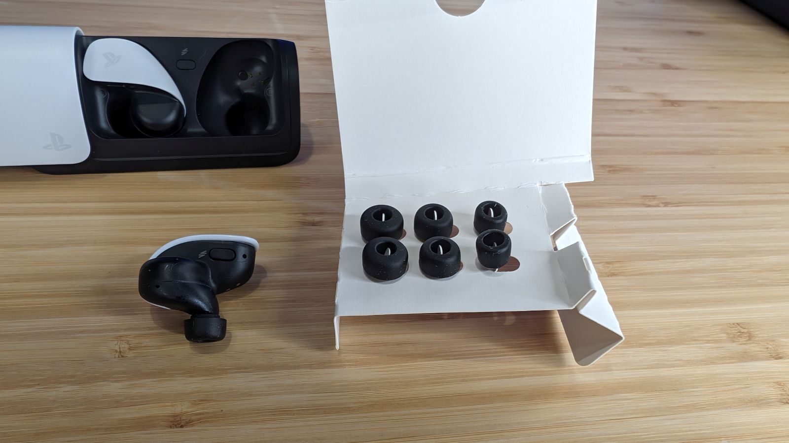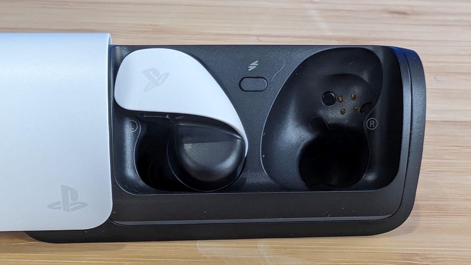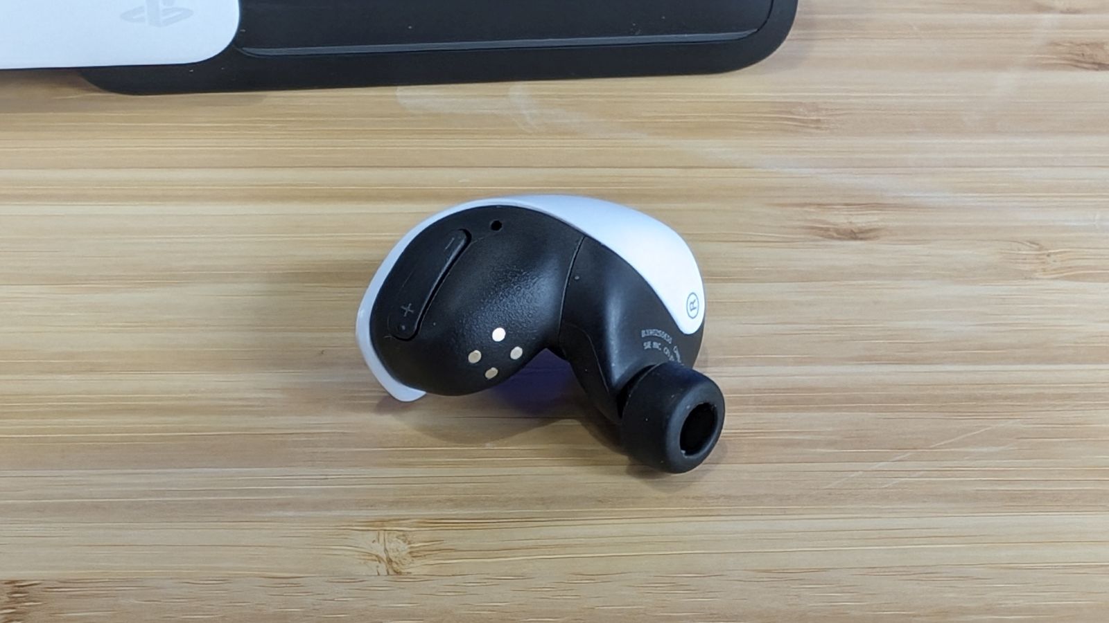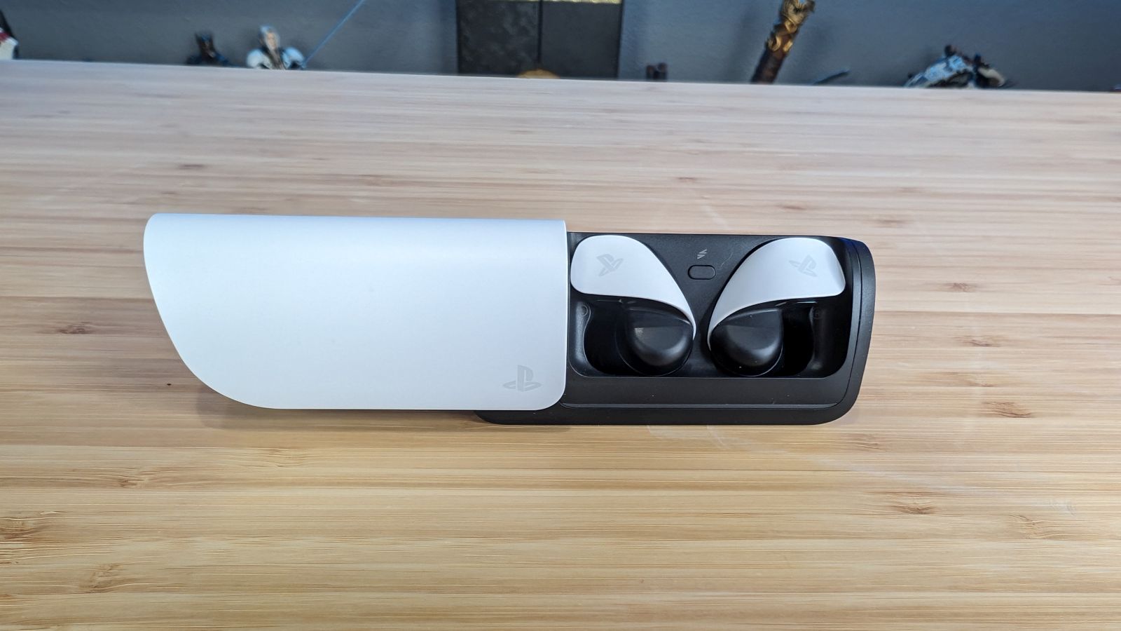 The charging case uses the same color scheme as the PlayStation 5, which should come as no surprise. It also has much of the same rounded appearance. The housing slides off to one side, revealing the earbuds underneath, as well as the synchronization button, and an indicator light to tell you whether the device is pairing, charging, or powering up. Tapping the sync button causes the light bar to blink, pairing the device with just about anything that’ll accept a Bluetooth connection.