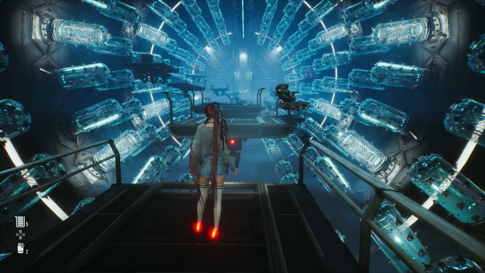 Most of the in-game areas are linear levels, although each of them offer good exploration opportunities. There’s a wealth of collectibles and upgrade materials to be found off the beaten path, often guarded by enemies, a puzzle, or a light platforming sequence. They’re well designed spaces that take advantage of EVE’s acrobatic move-set, and each sprawling level is packed with unique gameplay mechanics and set pieces. While there’s a lot of emphasis on combat, there are also moments where you’ll need to maneuver through rotating razor blades, scale dilapidated buildings, traverse rooms laden with security lasers, and other platforming challenges. There’s more platforming and light puzzle elements in Stellar Blade than we initially expected, and they help keep each new area fresh, exciting, and surprising. Jumping, climbing, and interacting with the world can feel a little floaty at times, but never enough to cause any significant frustration.