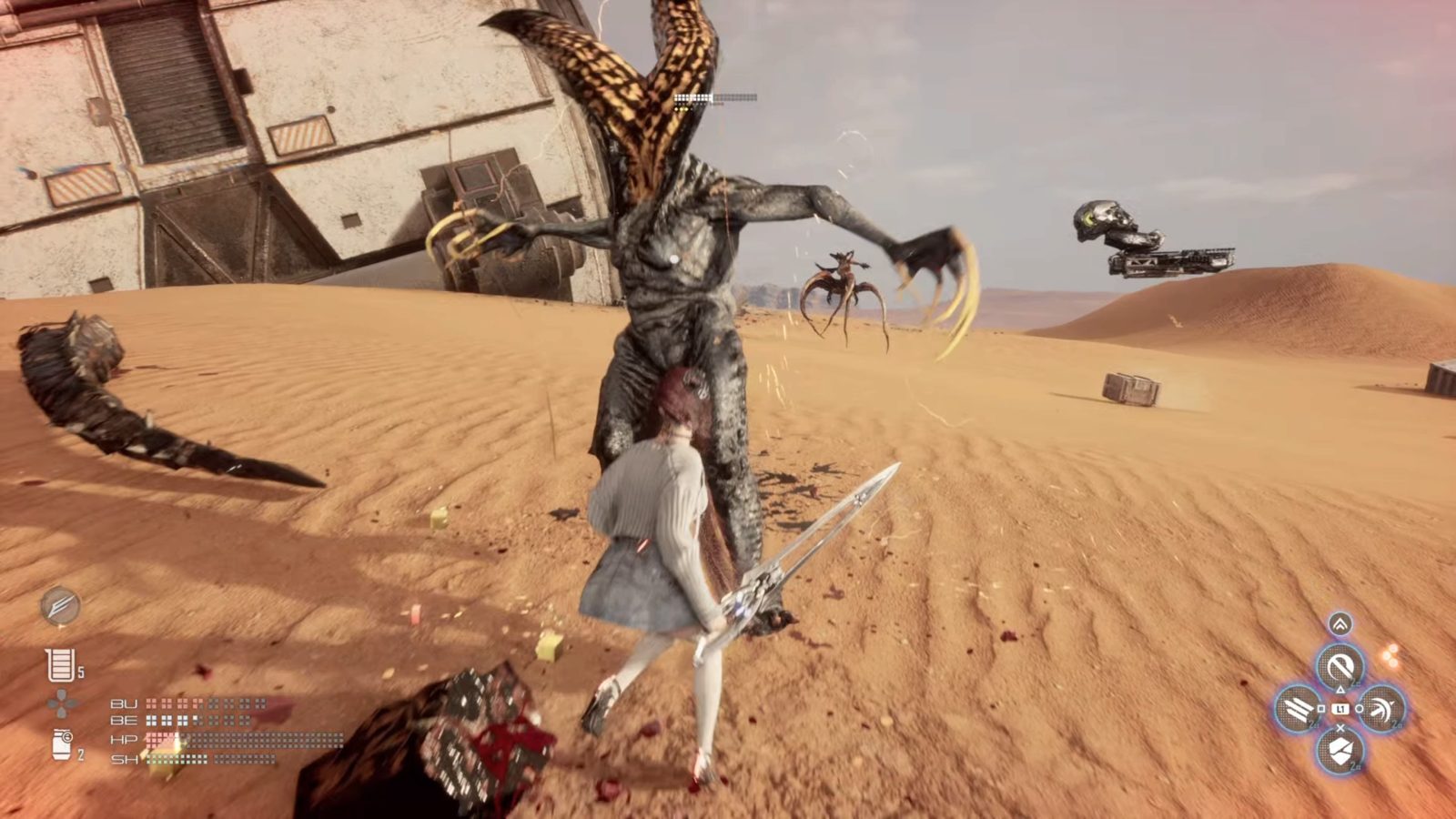 The overall combat in Stellar Blade feels slick and satisfying, especially when you get into the ebb and flow of enemy attack patterns. It just clicks after a while! We initially thought the movement was a bit stiff and awkward when we played the demo, but quickly got used to the game’s systems. A fluid combat system combined with intense cinematic sequences mid-battle that prompt you with a few quick time events in addition to fantastic enemy designs makes this game a must play for action game enthusiasts. There’s an impressive amount of enemy variety too, each portraying their own unique and grotesque configurations that reek of eldritch influence.