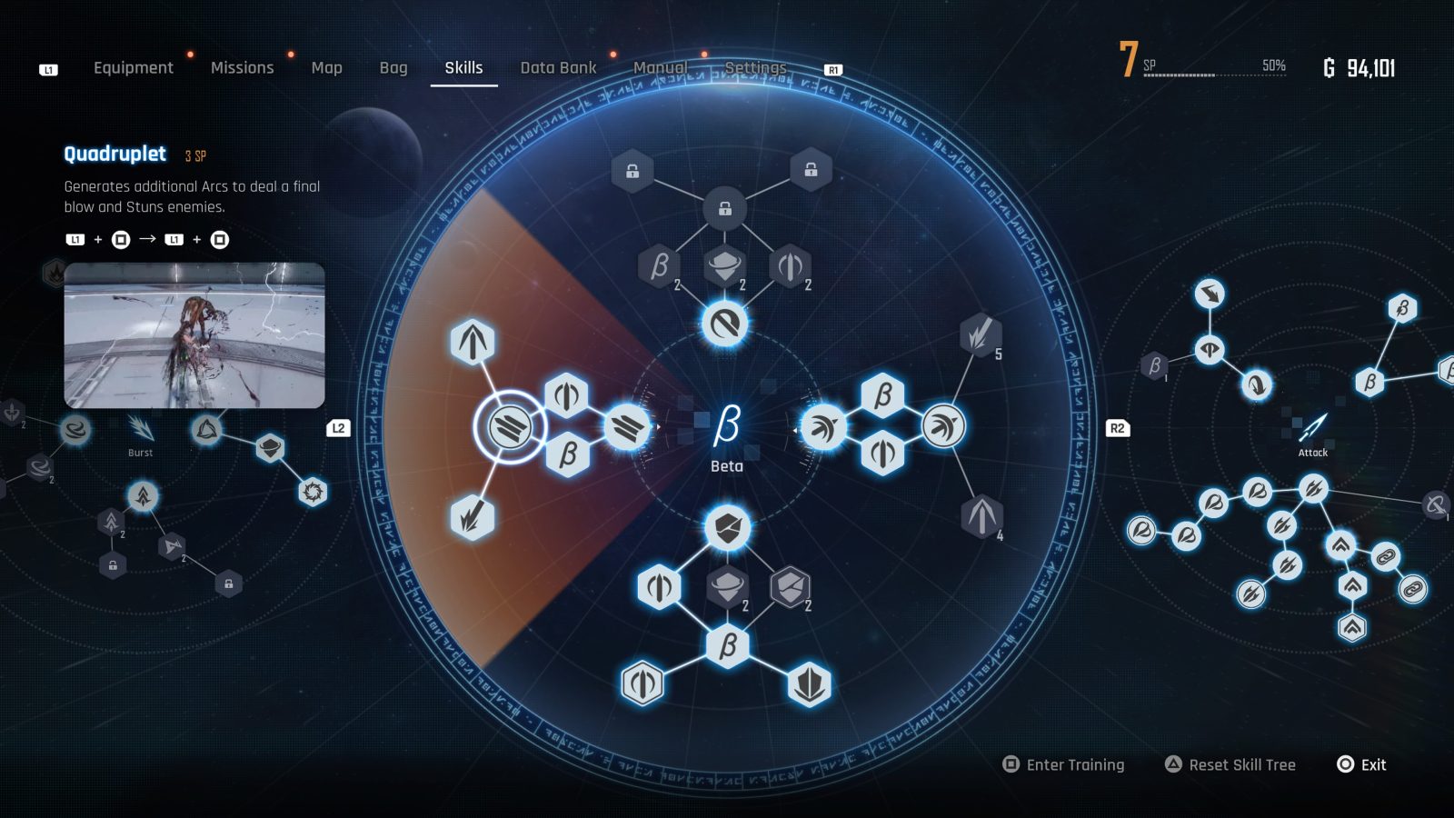 We would say Stellar Blade’s combat is most similar to none other than FromSoftware’s Sekiro, to a less punishing degree. However, it’s not as fluid and responsive as Sekiro. Stellar Blade is not a Souls-like game whatsoever, as there’s no stamina-based combat, a “soul” currency that drops upon death, or a robust role playing experience where you level up attributes such as strength or dexterity. We say it’s akin to Sekiro’s combat as there is an emphasis on defensive maneuvers such as perfect dodging and parrying as opposed to attacking. EVE has one blade that sticks with her throughout the entire game that she can upgrade after collecting enough materials. She’s able to equip different modules on her exoskeleton that provide different passive skills such as critical rate increase or decreasing enemy field of view. Defeating enemies grants experience that can be used to unlock nodes in a variety of skill trees.