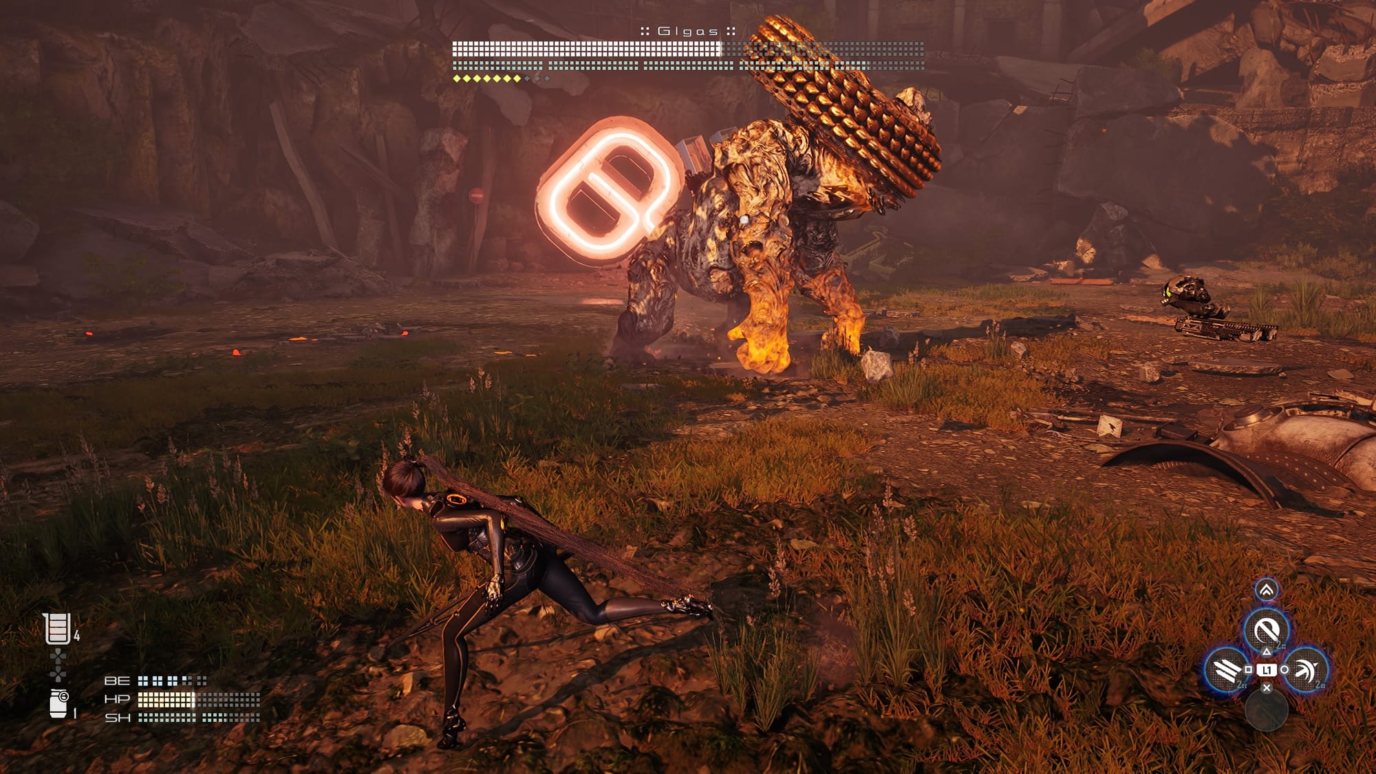 Now that we’re done with the basics of combat, let’s talk a bit about the various weapon skills that are up EVE’s sleeve too. Two separate bars can be seen on the in-game HUD: one for Beta Energy and one for Burst Energy. Beta is charged from regular attacks and can be expended to perform weapon arts like the triplet or shield breaker. Burst is charged from perfect dodging or performing Blinks and can be used to perform even more devastating blows during combat. Don’t forget about the trusty drone that Adam/Lily maneuvers during gameplay as well, as it can be transformed into a ranged weapon of various uses too, including a rifle, shotgun, or even a homing missile launcher! The developers know exactly how to keep gameplay fresh by inserting gun-only sections that forbid you from using melee attacks against enemies.