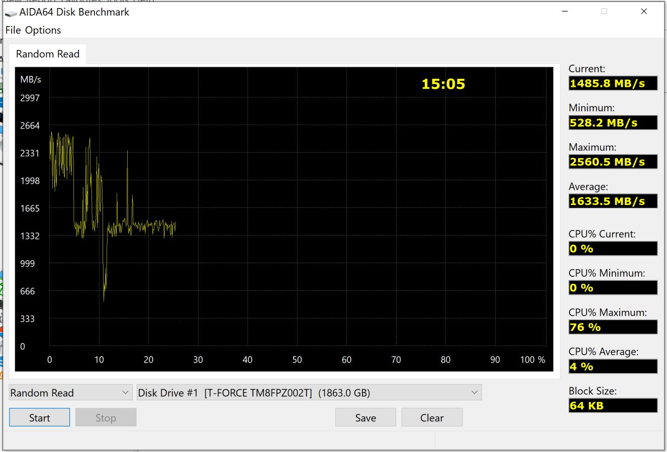 Using AIDA 64 we can see some of the same behavior. Running a sustained read test we see the speeds start off rocket-fast, and then we see them dip hard, and then pop back up to a very reasonable average that will hold indefinitely – around 1.63 gigs per second of real-world transfer speed. That’s near the top of the speeds we see in drives in this category and impressive.