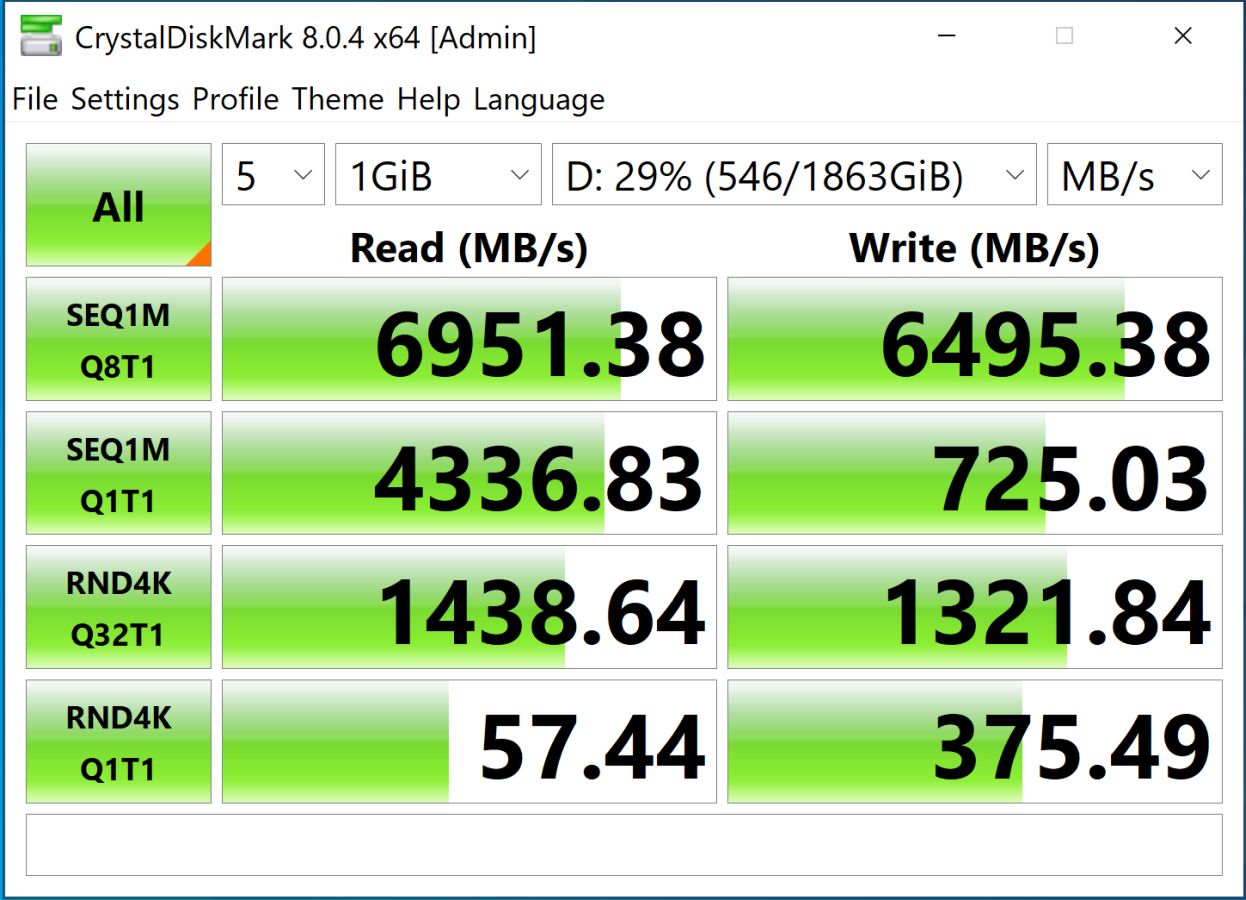 Back on PC, I’m testing this on an MSI Z790 Motherboard with an Intel 12900K processor and DDR5 running at 7000 MT/s – no bottlenecks on the test rig. We run our synthetic tests using a number of utilities including 3DMark, AIDA 64 Professional, ATTO, and Crystal Diskmark. While these will show the theoretical maximums, which is important to see the highs and lows the drive can achieve, they also give a comprehensive overview of performance over time. They also show what happens when you hit DRAM exhaustion, as well as some real-world examples of what you might see in practice. Let’s start off with Crystal Diskmark.