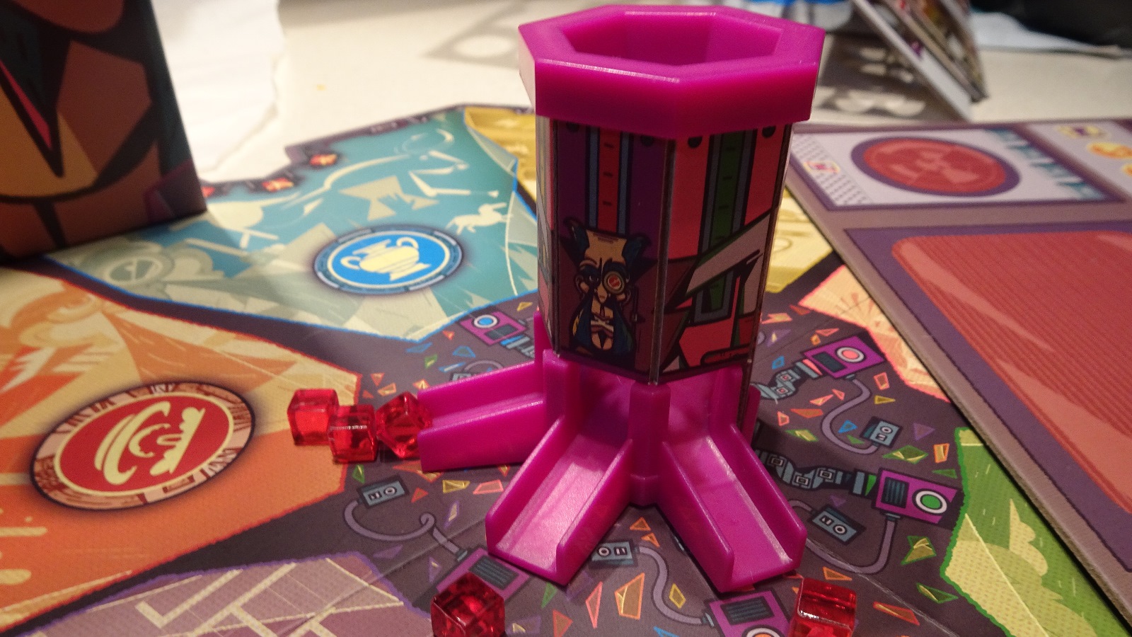 Each turn a group of clones of the evil Dr. Faux are drawn randomly and placed around the board based on their era. Each one also has a ‘destination era’ that if moved to, causes that clone to be removed from the game. These clones also function as an intensifier for the assignment of damage cubes. On each player’s turn, the cube tower will be rotated based on a drawn card to a specific era, and cubes will be loaded into the chute based on how many clones are there – the more clones, the more damage that will be done. The chute has three branches that randomly shoot the cubes out, and are a good source of tension when an era is on the verge of being lost and players are cheering for the cubes to not land on them.