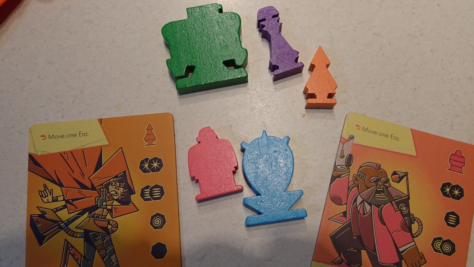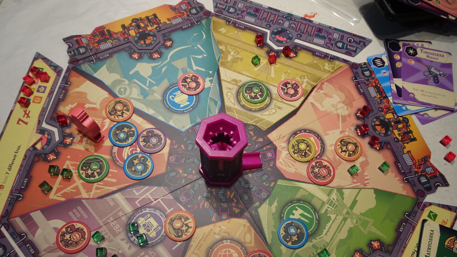 Centralized around the main tower, the board is composed of various time eras, from historical to futuristic, which players must navigate to eventually defeat Dr. Faux, the time traveling villain in this game. Time is limited as every turn more clones spawn, and more damage cubes are placed, if four are ever placed in an era it is permanently lost. Lose enough of these and the game is over. As a result players are torn between trying to build up their decks, dealing with fighting clones, and combating the ever-encroaching destruction of eras. This is all while also completing small missions that often involve doing less than ideal movements, all to eventually break the time machine before everyone is lost in an endless loop.