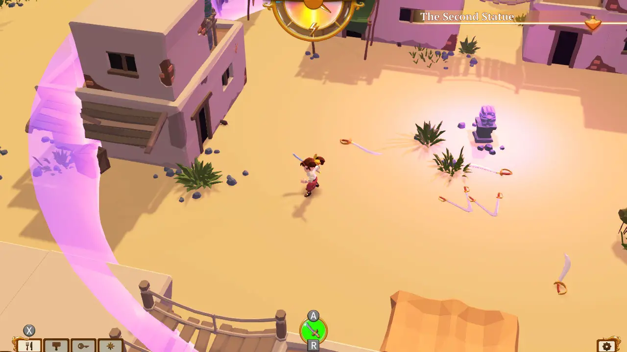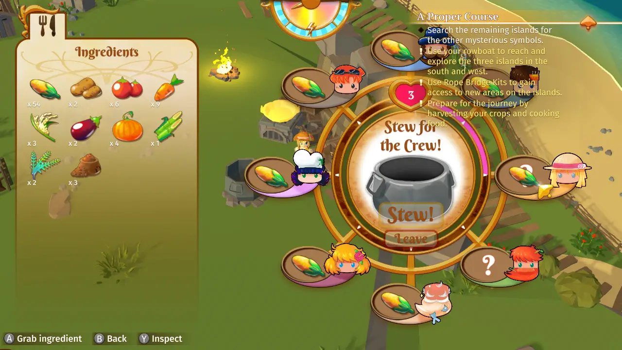 The game presents itself in a low-poly art style. Usually I like this kind of art direction. When done well, it can look like a higher resolution PlayStation 1 game: All of the nostalgia with none of the blurry textures. But in Stranded Sails, the character models look like knockoff LEGOs and the environments seem like slightly altered stock assets. The menus and the interface feel over designed; the quick select for tools, seeds, and food look nice but are confusingly laid out; and while it does work in the most literal sense, they are difficult to navigate and understand. For example, when attempting to cook a recipe you don’t know yet, you’re tasked with placing the needed ingredients in the correct slot. The game will notify you when one of the ingredients is correctly placed, in the wrong spot, or doesn’t belong in the recipe. However, it is extremely difficult to tell which of these symbols applies to which ingredient because, while the ingredients are placed in a plus sign pattern, the right and wrong symbols are just placed in a straight left to right order and it’s impossible to tell what symbols apply to which parts of the grid. Multiple times the game told me an ingredient was in the right place but when trying to cook again with the exact same configuration it would tell me that they were actually all wrong.