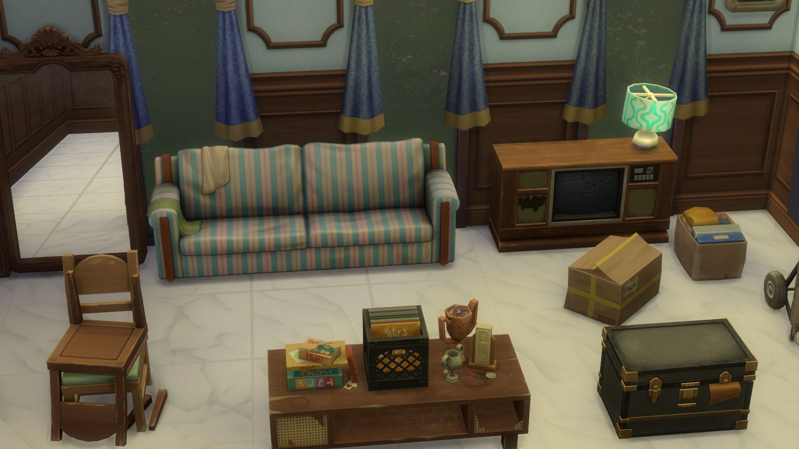 The Basement Treasure’s Kit added in a lot of vintage items you might have found in your grandparents house. An old box TV, a ruined couch, and a disassembled heart-shaped bed (please devs, don’t tease us…bring it back) are just some of the oldies you’ll find in this Kit. Most of these items are niche, but I would love to play around with them on the Paranormal save I have, as I think they’d fit in great with my haunted house.