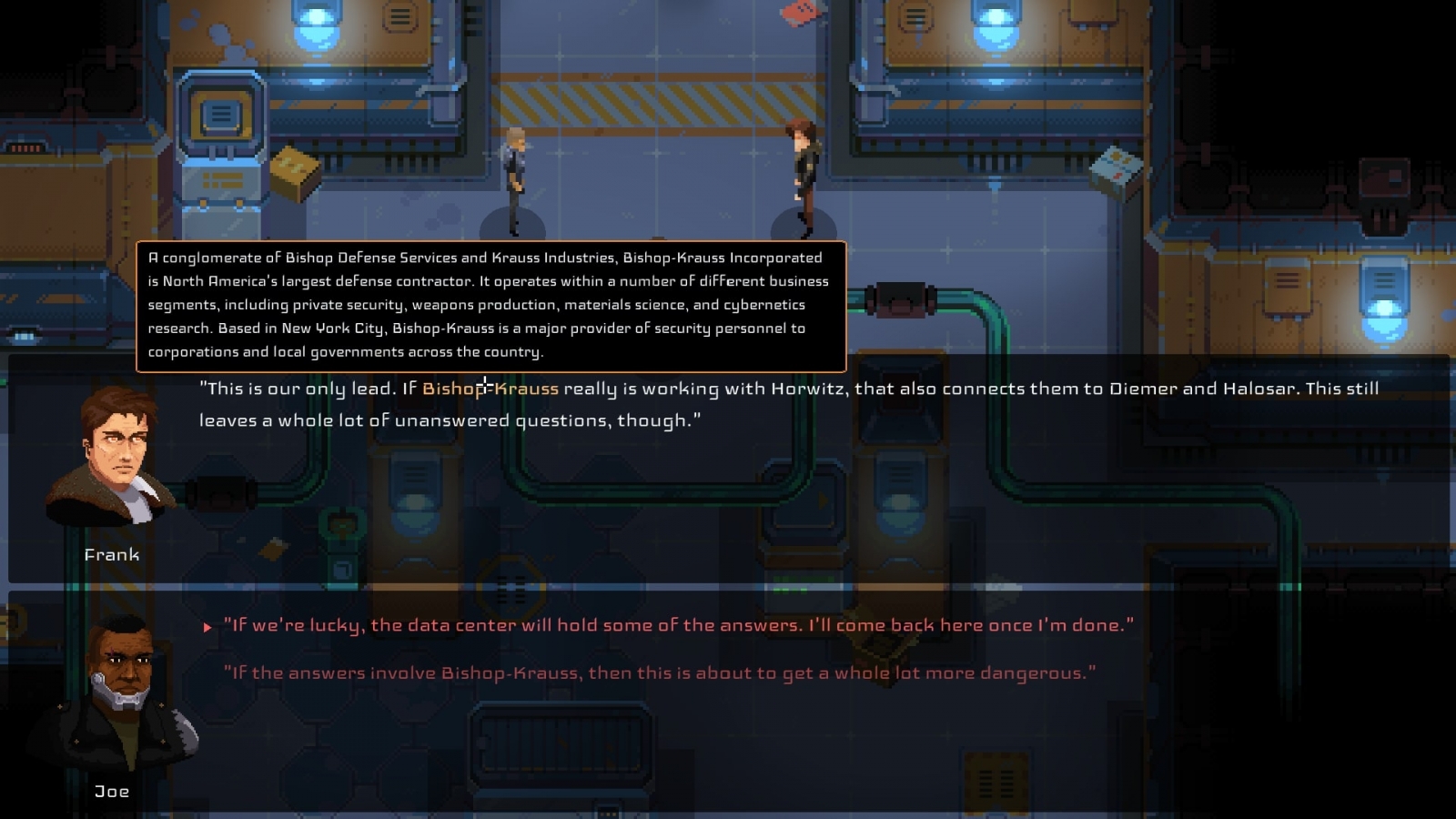 Disjunction presents the grimy, gritty aesthetics of the genre with a certain degree of cleanliness and elegance that directs every facet of the game from its pixel art and synth-driven soundtrack, to the smooth stealth-focused gameplay. It’s undoubtedly a polished game — one free of any rough edges and unnecessary features that would muddy the waters. But just as it avoids spotlighting any obvious blemishes, its surprising lack of variety, despite its three playable characters, gives way to tedium.