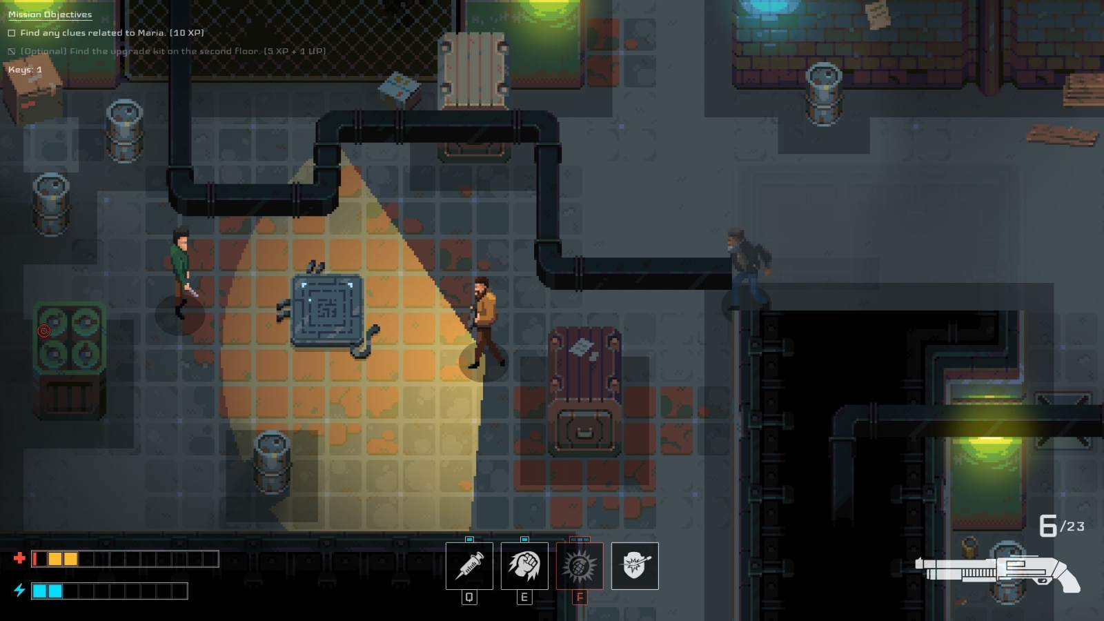 Infinitely more pressing are the game’s meticulous enemy placement and patrolling patterns. Enemies, of which there are many, patrol rooms in hopes that a vigilante like yourself stumbles into their vision cones. Certain enemies, namely bots, have unique vision cone patterns that need to be learned. Like any solid stealth puzzle, observing these patterns and squeezing through any openings are the key to success. No ability is more important than your character’s crouch, which muffles your footsteps and reduces the size of enemy vision cones, provided you’re hugging a wall or object. Then comes your melee, which lets you dish out damage from the shadows — just make sure you hide the bodies out of sight.