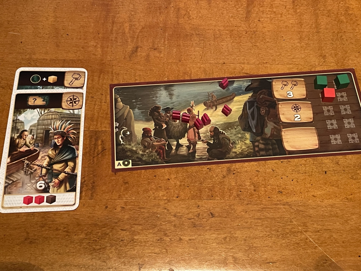 The cubes included in A New World are similar to the ones in the other Century games, while the scoring cards are similar to the tarot cards in Spice Road. The location boards are a bit thin feeling since they aren’t cardboard and get used in every single game. The only other complaint that I have about the components is the fact that the meeples used as settlers you use for placing on a location are tiny. They’re so small that they can be difficult to pick up and place. I understand that keeping the same form factor for all the boxes in the Century series is important and using less materials is a noble cause, but the production values make A New World feel a bit cheap in comparison to the other games.
