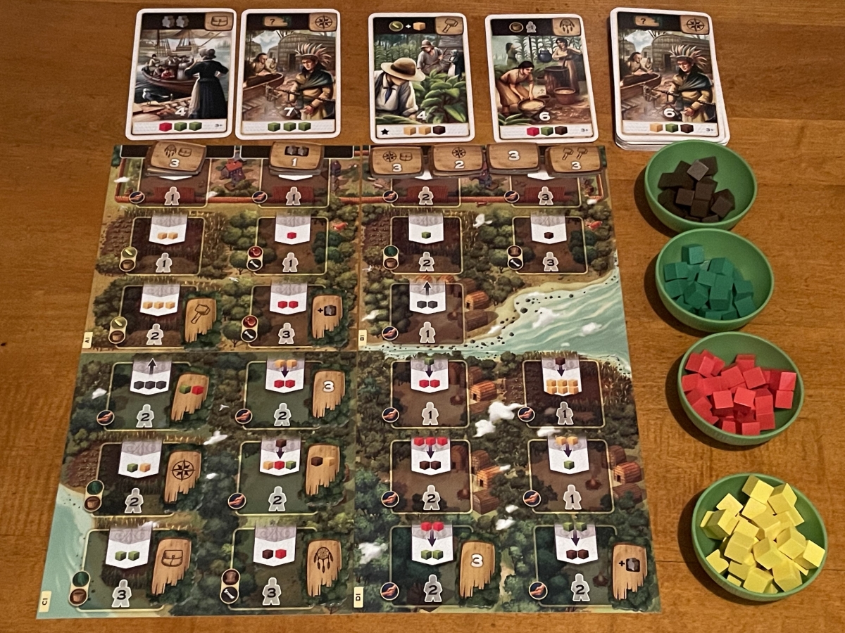 One problem with worker placement games is the first player advantage. While giving players who start later more resources, the fact that players can use a space someone else has claimed does help even the playing field. You also might be planning to rest on your turn to get your settlers back when another player decides to use your spot and you find yourself in a position to work that turn, allowing you to play again quicker. The fact that you don’t need to reset the board for player rounds speeds up the game significantly too.