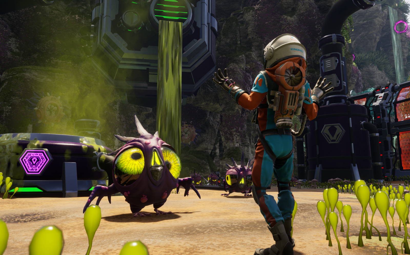 Usually found in areas where you have to search for proof that Vyper is dumping their toxic waste, these hunks of metal throw everything at you and definitely up the challenge level. Some require you to use explosives, acid, or lightning to drop their shields and expose their core, where precise shots from your pistol will turn them into a pile of recyclable junk. Because these encounters only happen within certain areas where your objectives lead you, it makes the rest of the beautiful and foliage-rich island come off as a bit of wasted space. Though it has never been the main focus behind Journey to the Savage Planet, one can’t help but to think there needs to be more encounters where the player is forced to use their platforming and shooting skills, and not just when there’s a boss battle. Where this DLC sets itself apart from the base game and jettisons itself into a new stratosphere with me was during the battle with Kronus.