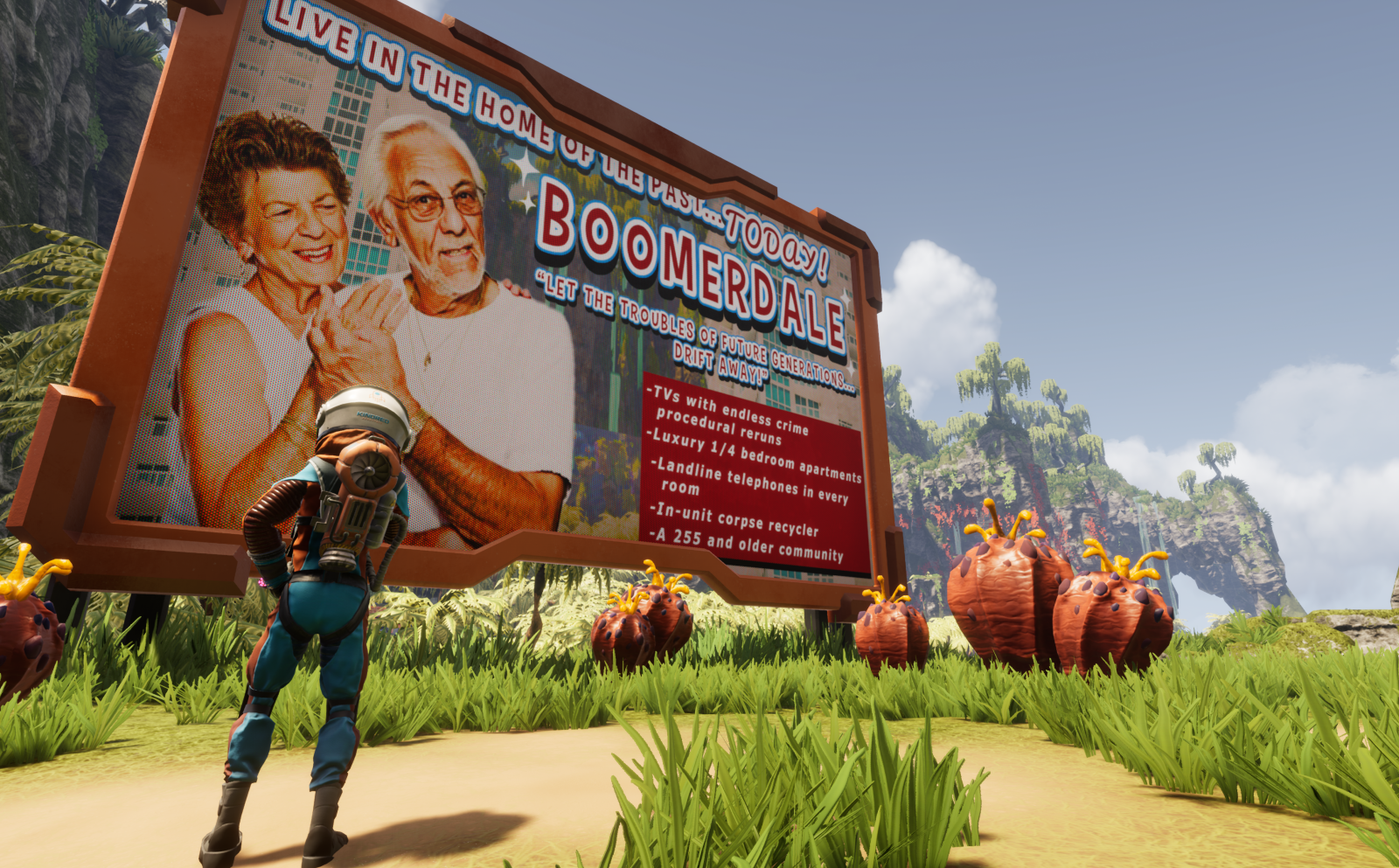 Teleporting in the usual fashion but arriving on a Vyper corporation teleporter, you’ll find yourself standing in front of a massive sign welcoming you to Boomerdale, a pleasant place for those up in age to come and rest their weary bones. Of course, this pokes fun at the boomer generation that we’ve all come to know and love, but I won’t open that can of worms (not that they would play video games or read this review). Looking around, you’ll find yourself taking in the cool ocean breeze as you glare out over the ocean blue. You see, planet DL-C1 is an all new planet with new flora and fauna, but, unfortunately, there’s not enough to make it feel like a completely new world.