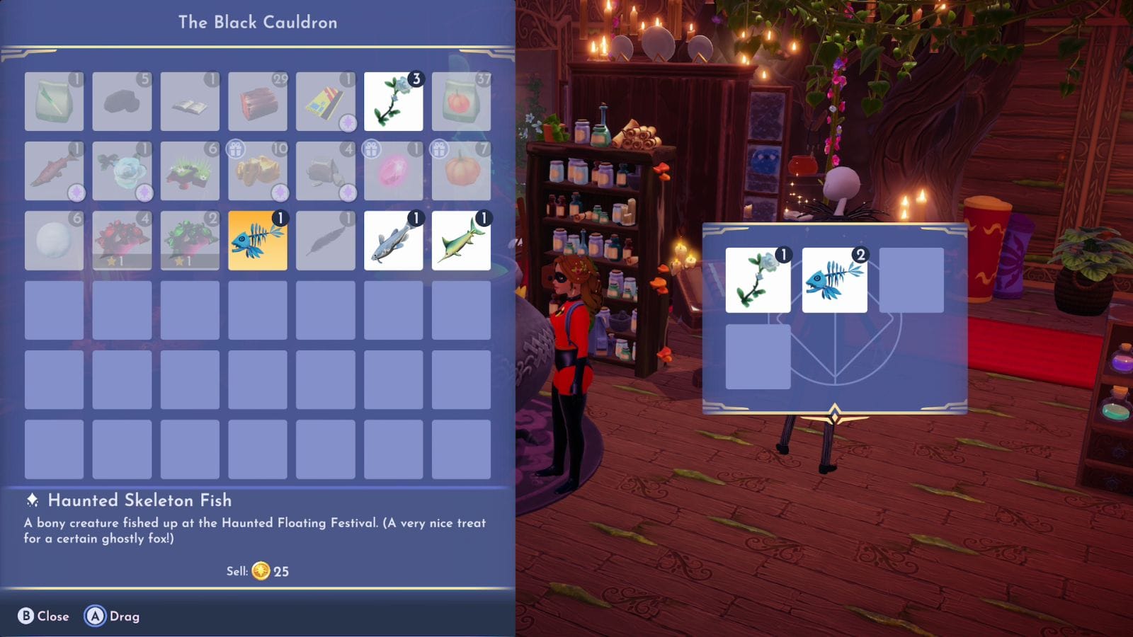 To solve the fourth puzzle, you will need some outside ingredients. The list goes as follows: 1 Haunted White Rose, 2 Haunted Skeleton Fish, 1 Catfish, and 1 Swordfish. Put them in the cauldron, and once you put every item in, you will get your reward!