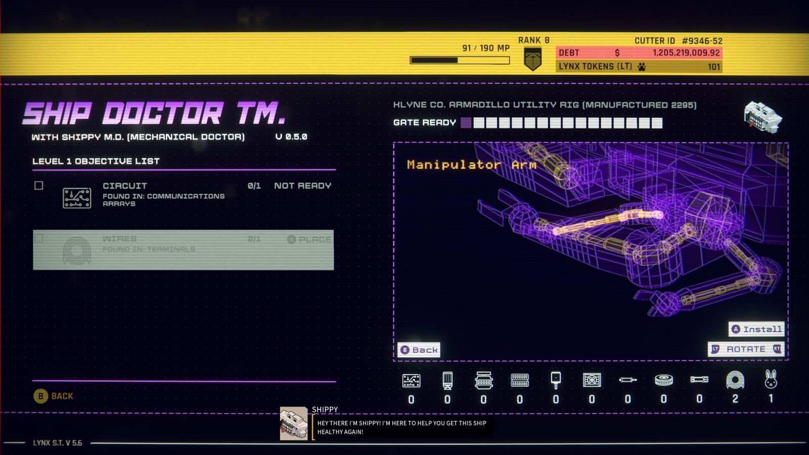 You aren’t just sorting for fun – remember you have over a billion dollars of debt to settle. The progression of the game is tied to this debt to a small degree, but more to your level and the precious LT you’ll collect by hitting salvage milestones. Lynx won’t trust you with their 34 million dollar mega ships in the beginning, instead giving you little shuttles to poke at. These have few hazards, but they are also worth less should you blow them up. Looking at their salvage potential you’ll find ticks over specific points that indicate milestones. Hitting these milestones gives you LT that you can spend back in your habitat to improve your gear. Doing so helps you be more efficient so you can take down larger ships quickly, maximizing profit return.