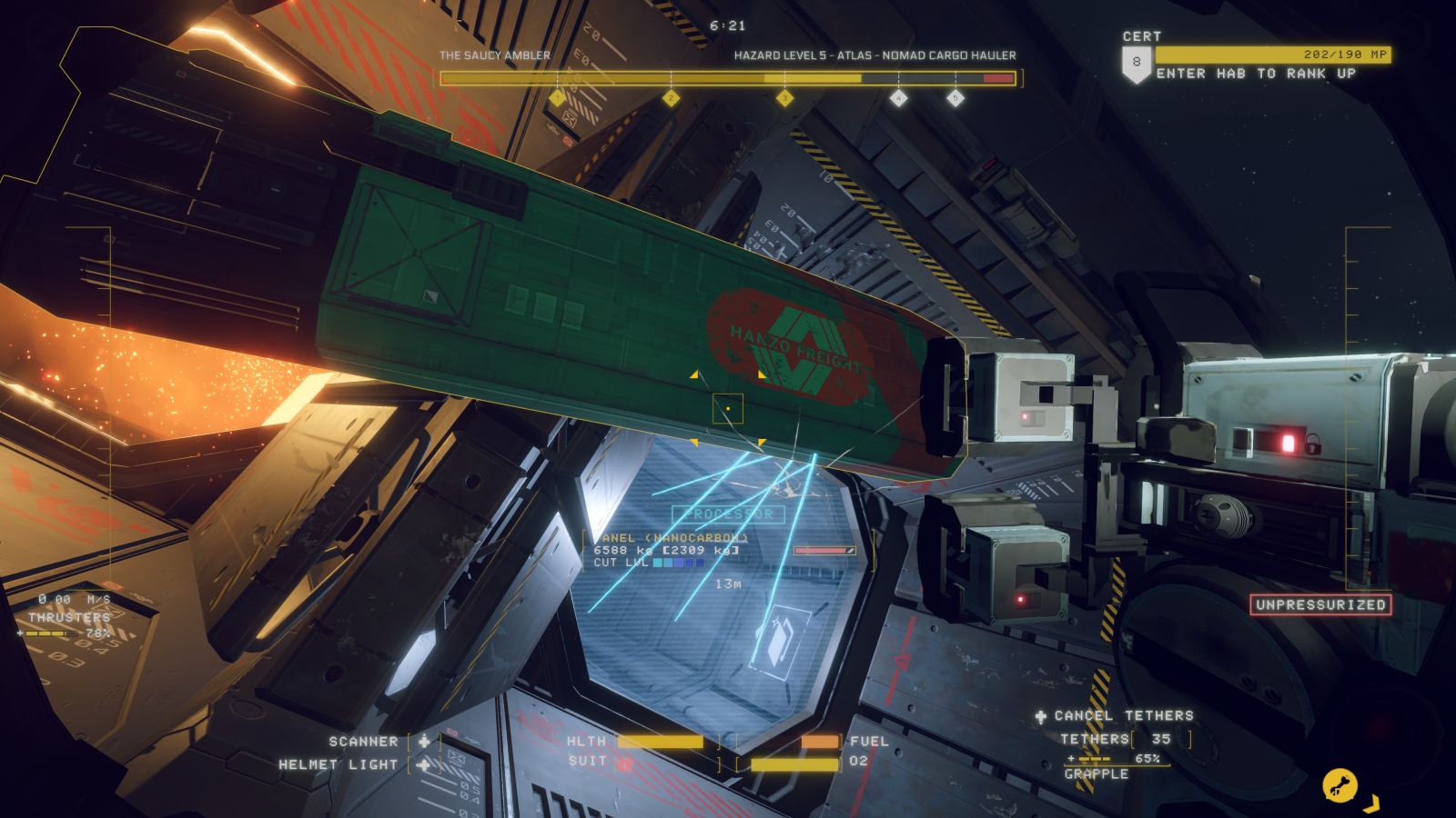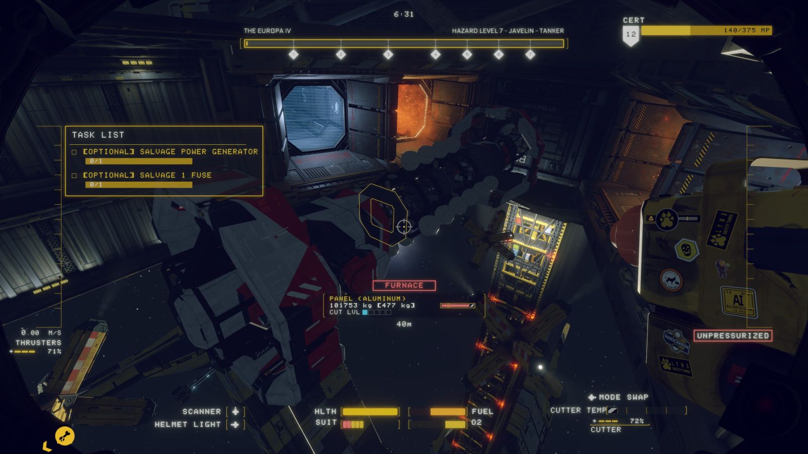 Each milestone gives you experience towards leveling up. This grants you access to salvage bigger and better ships, but also unlocks various equipment upgrades. This can add range to your laser, cool it faster, allow you to push larger objects with your grapple gun, carry additional charges, unlock a controlled demolition charge, and much more. Those larger ships will bring new dangers along with them. Many more compartments are compressed, requiring careful cuts lest you suddenly trigger a costly explosive decompression. When things start flying, you never know what it’s going to break as it’s now officially at the mercy of the physics engine. I had a battery pack fly from a nearby room all the way into the engine compartment, clanking against a valve, and triggering an explosion that turned my precious ship into shards of debris all destined for the furnace. When you do screw up, the overall value of the ship drops, meaning you can’t hit the latter salvage targets. Since these are directly tied to how much experience and LT you receive, you are only hurting yourself. Hurt yourself enough and you’ll come face to face with the $150,000 upcharge for regenerating a new body for yourself. That eats into your profits, so try not to do it, eh?