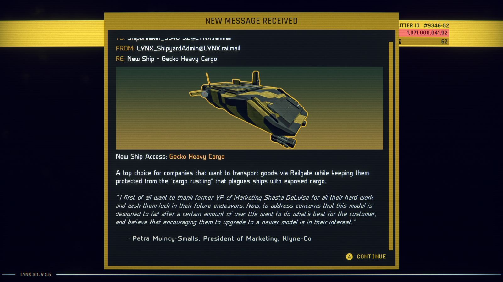 Tucked into every corner of this game is a dark and pervasive humor that I absolutely love. For example, while getting a rundown of the specs on a new type of ship I was told that the engineers believed that they couldn’t build a sturdy ship of this type with the materials that were on hand, so there was clearly a change needed. “The new engineering team agreed that the materials were fine”. Similarly, the game will warn that suffocating could lead to damage to Lynx equipment, and that’d be bad.