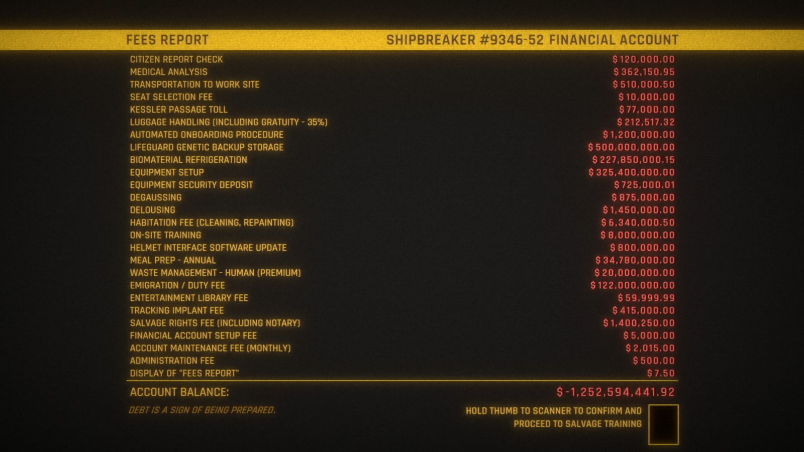 Before you start the game proper you are living on Earth, and it’s become as derelict as the ships you’ll be cutting to bits. With effectively zero prospects on the horizon, you take a risk and place your thumb on the contract for the Lynx Corporation to work as a salvager. Lynx will happily sponsor you for the job, but there’s the matter of your transport to space, backing up your physical body for “spares” should you die, equipment rental and maintenance, a place to live in space, and more. How much does all this cost? Just over BILLION dollars. But don’t worry – you can make payments to earn your way out of that debt. The generosity of Lynx knows no boundaries, as long as you pay your bill before 10:00am every day.