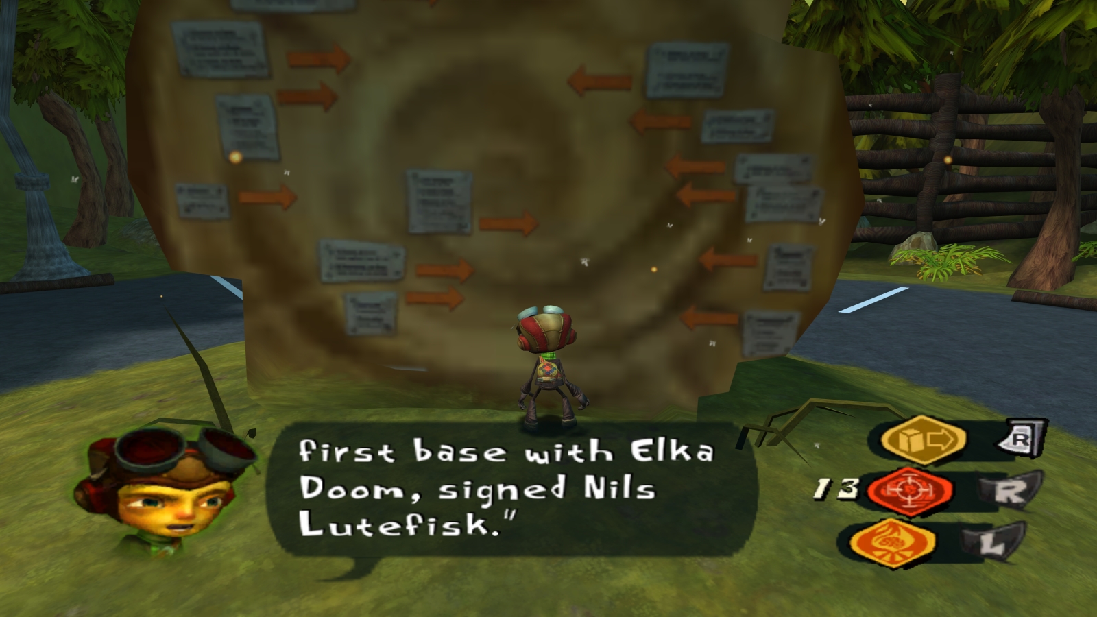 Whispering Rock is the game’s hub, and there’s a ton of stuff to do here. You start off by the kids cabins, but just outside of that is the main lodge and parking lot from which you can enter the woods or the lake. The area is an “Indian burial ground”… meaning Native Americans buried some of their stuff here, like arrowheads! Because the arrows are made of psytanium, the camp uses them as a currency in the main lodge’s shop, which is run by an elderly gentleman you’ll quickly grow familiar with as he seems to run literally everything around here. The shop sells crucial items like the dowsing rod, to find deeper, more valuable arrowheads, and the cobweb duster, which removes mental cobwebs. Around the camp, you can also find cards scattered about and some giant eyeballs with cards around them. Once you’ve discovered Agent Ford Cruller’s (the old man around camp) secret underground base, you can use his machines to convert mental cobwebs into a card, and a set of nine cards along with an eye from the camp store to create a full set and increase your rank by one. Increasing your rank will get you new powers, such as telekinesis, or upgrades to existing powers, like being able to throw things further with TK.